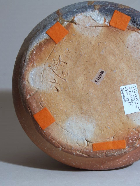 Vat gebruikt voor vers water tijdens de theeceremonie. Bedekt met grijzig glazuur. Gedecoreerd met concentrische banden. Twee handvatten.||Shigaraki||Hiromu, Furutani||Keramiekmuseum Princessehof MPH 2007-235.A1-A2 |