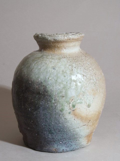 Schoudervaas met bolvormig lichaam en korte, uitlopende hals. Bedekt met een grijs-groen glazuur||Shigaraki||Hiromu, Furutani||Keramiekmuseum Princessehof MPH 2007-236.A