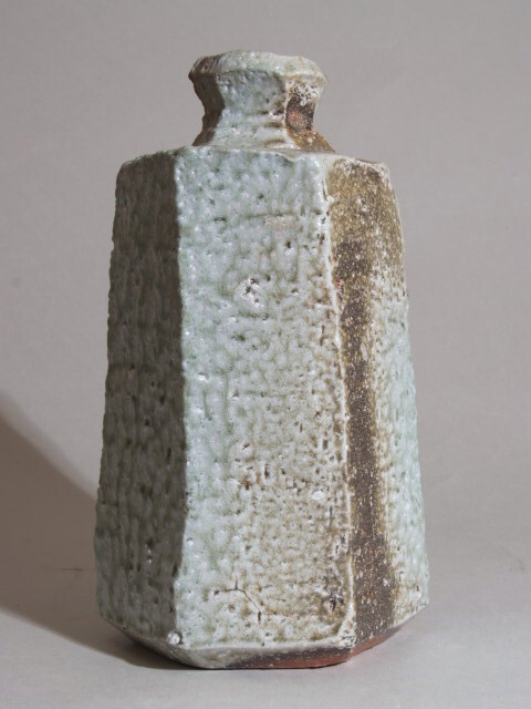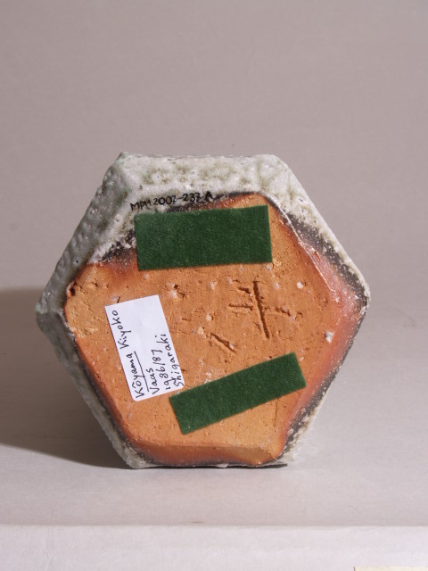 Zeshoekige vaas met korte, uitlopende hals. Bedekt met grijs-groen glazuur. (Nederlands)