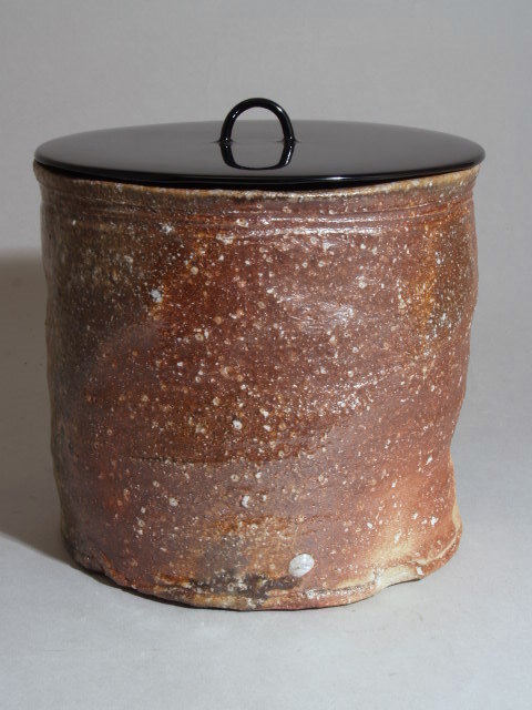 Pot met lakwerk deksel. Voor vers vers water gebruikt bij de thee ceremonie. Deels bedekt met groenig glazuur. Duimafdrukken langs onderrand.||Shigaraki||Shunsai, Takahashi||Keramiekmuseum Princessehof MPH 2007-239.A1-A2 |