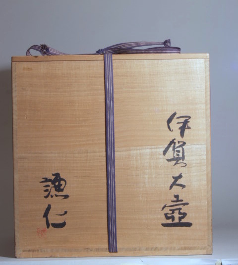 Houten doos met lint om mee te sluiten, op de doos Japanse tekens. In de doos een doek ter bescherming. Dient als verpakking voor pot (Nederlands)