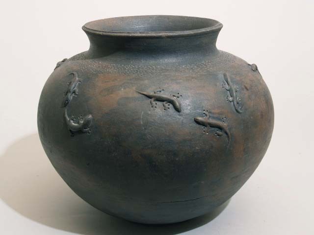 Wijwatervat gedecoreerd met tjitaks (hagedissen) in reliëf||onbekend||Keramiekmuseum Princessehof MPH 2007-241 |