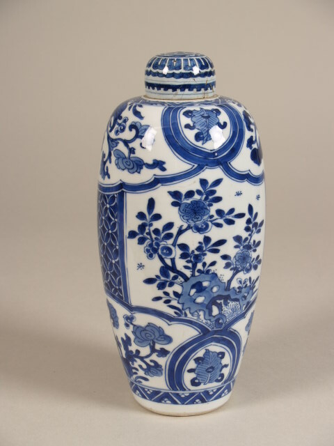 Vaas met deksel. Versiering in kobaltblauw. De buitenwanden door geschulpte banden in onregelmatige vakken verdeeld, waa...uitrand; deksel: staande wand, konveks bovenvlak.||China||Delft||onbekend||onbekend||Keramiekmuseum Princessehof NO 04692.C