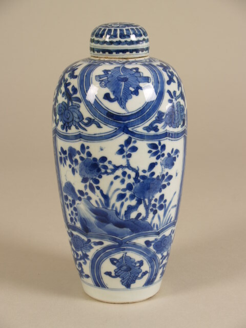 Vaas met deksel. Versiering in kobaltblauw. De buitenwanden door geschulpte banden in onregelmatige vakken verdeeld, waa...uitrand; deksel: staande wand, konveks bovenvlak.||China||Delft||onbekend||onbekend||Keramiekmuseum Princessehof NO 04692.E