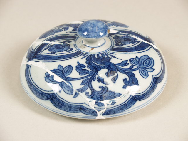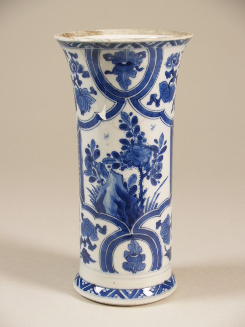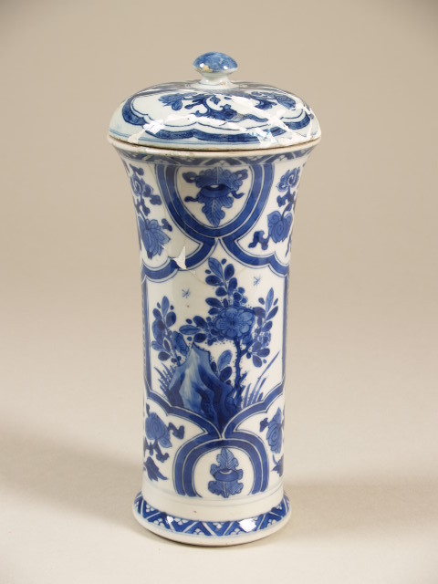 Vaas met deksel. Versiering in kobaltblauw. De buitenwanden door geschulpte banden in onregelmatige vakken verdeeld, waa... sluitring, konveks bovenvlak, gerekt bolle knop.||China||Delft||onbekend||onbekend||Keramiekmuseum Princessehof NO 04692.F |