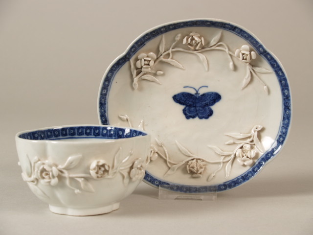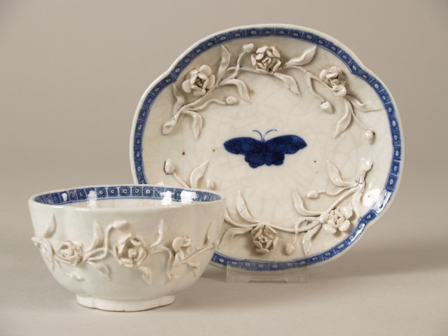 Kop en schotels met omtrek in vierpas-vorm evenals de afgeplatte voetring; op eide 2 opgelegde en met de hand gemodellee...l in het plat van kom en schotel: een vlinder; langs rand; "cell-border".||China||Keramiekmuseum Princessehof QGMP 1982-029