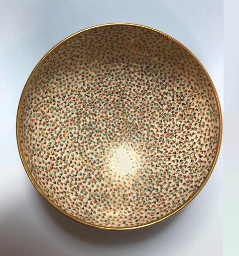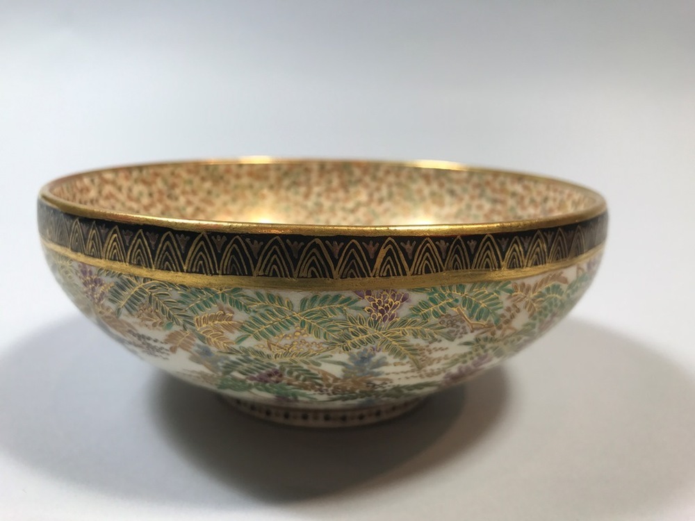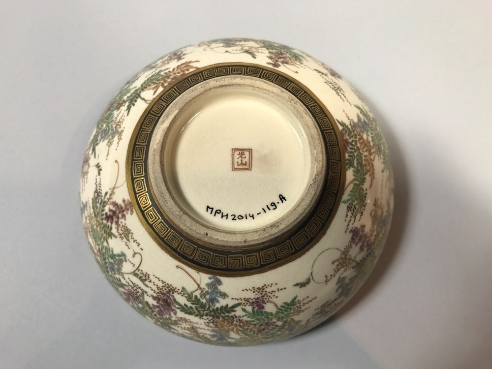 Kom, gedecoreerd in Satsuma stijl met emaile en goud, aan de buitenzijde een decor met wisteria en aan de binnenkant vlinders (Nederlands)