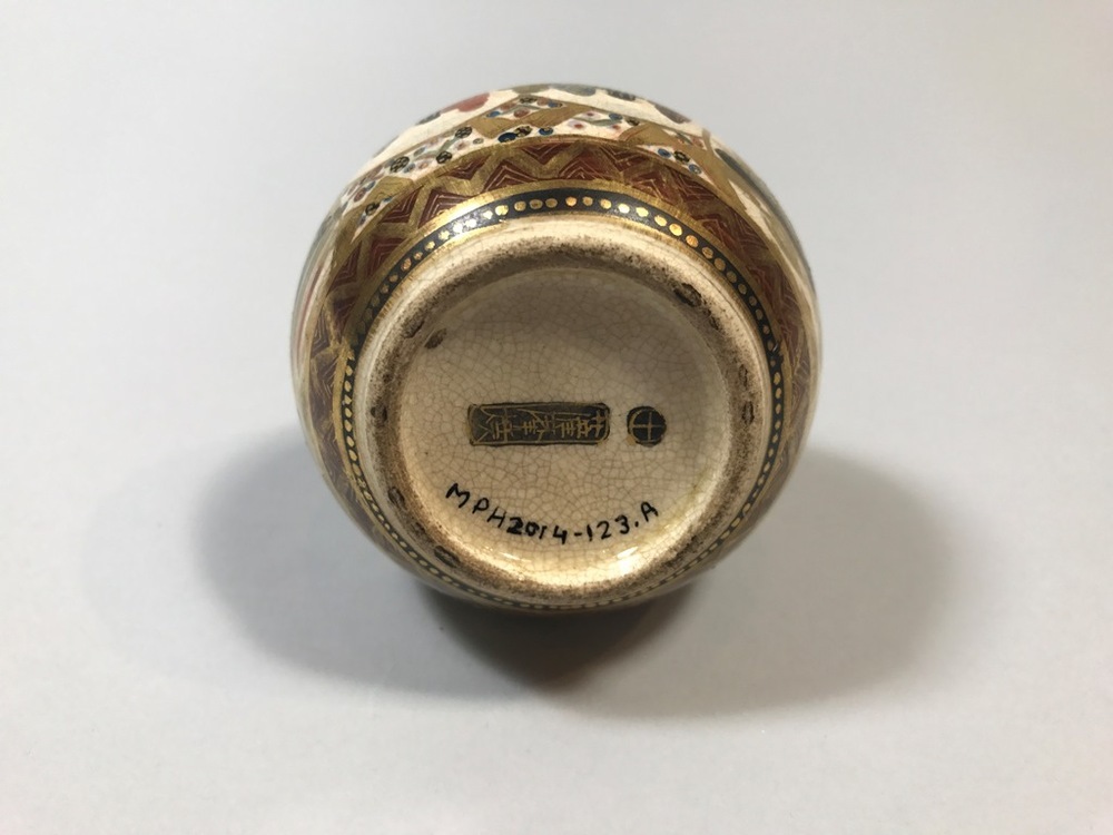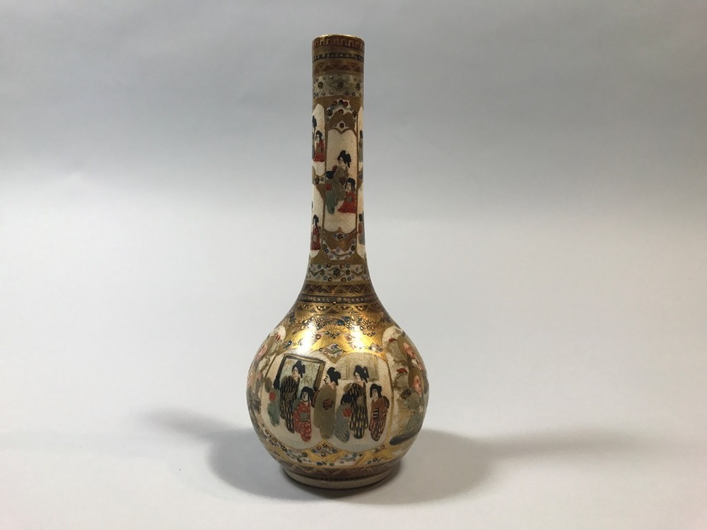 Kleine vaas met bolvormige buik en een lange nek. Beschilderd met kleine variaties met groepen elegante dames in kimono. De ondergrond heeft een dicht patroon van bloemkoppen op goud. (Nederlands)