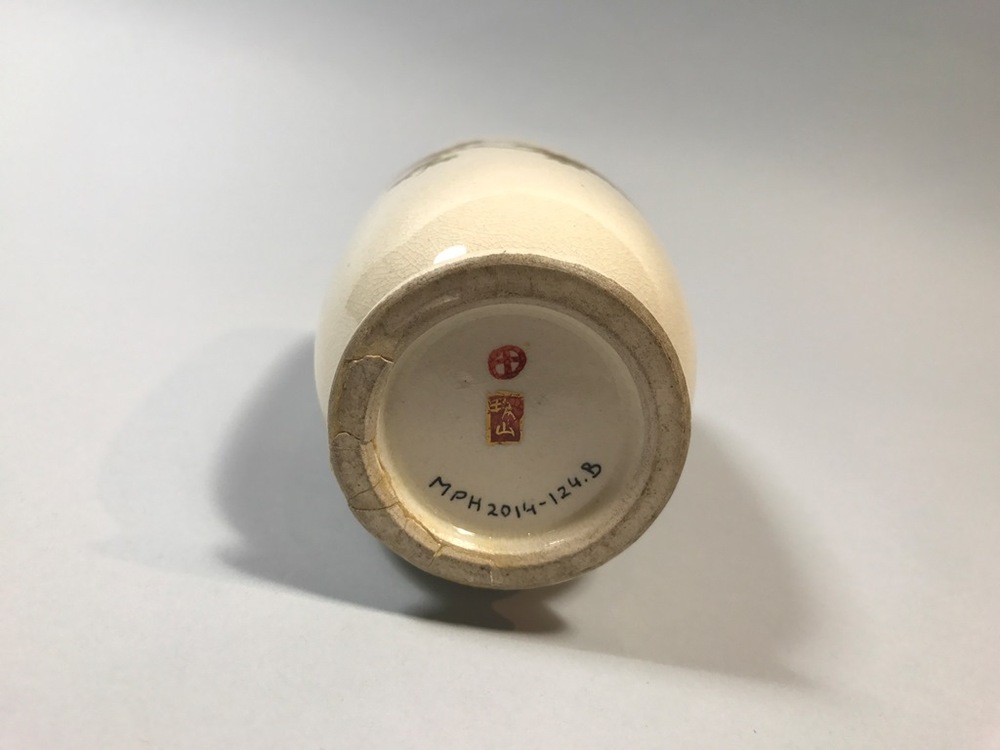 Een van twee vazen, gedecoreerd met esdoornbladeren in email en goud, Satsuma - Satsuma pair of small vases, decorated in enamels and gold, with a design of maple leaves (Q27651)