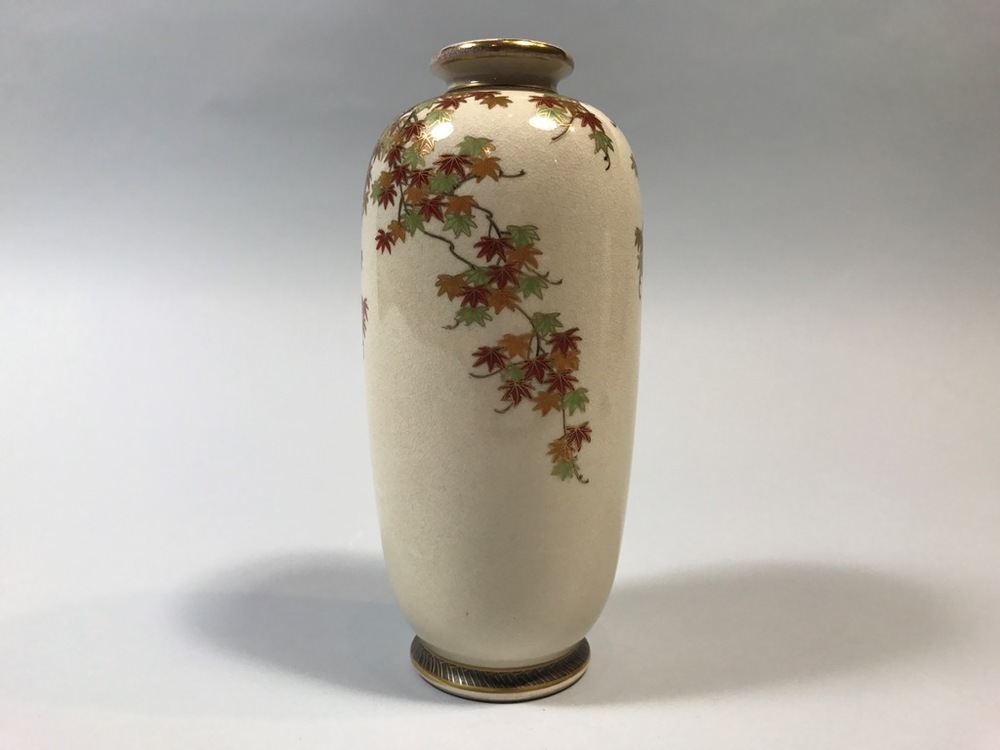 Een van twee vazen, gedecoreerd met esdoornbladeren in email en goud, Satsuma - Satsuma pair of small vases, decorated in enamels and gold, with a design of maple leaves (Q27652)