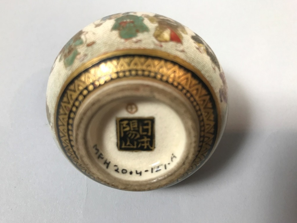 The small vase has a globular body and a short waisted neck. It is painted on the body with enamels and gold with figures and on the shoulder with textile pattern. It comes with a wooden stand in a traditional box, covered with brocade with a design of sprigs of cherry. (Nederlands)