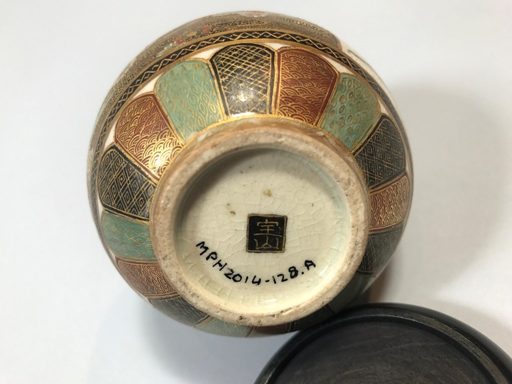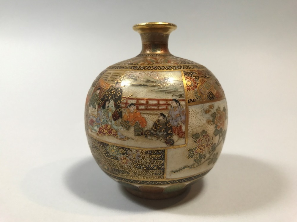 Kleine vaas met bolvormig lichaam en een korte hals gedecoreerd in Satsuma stijl met emails en goud. Op de buik een decoratie van verschillende op textiel geïnspireerde patronen en verschillende kaders gevuld met decoratie. Aan een kant van het vaasje bevindt zich in een kader met een groep mensen gekleed in kimono. Op de andere zijde in een kader zijn vrouwen in kimono in een tuinsetting afgebeeld. De andere kaders zijn gevuld met bloemranken omgeven door gouden stippen. (Nederlands)