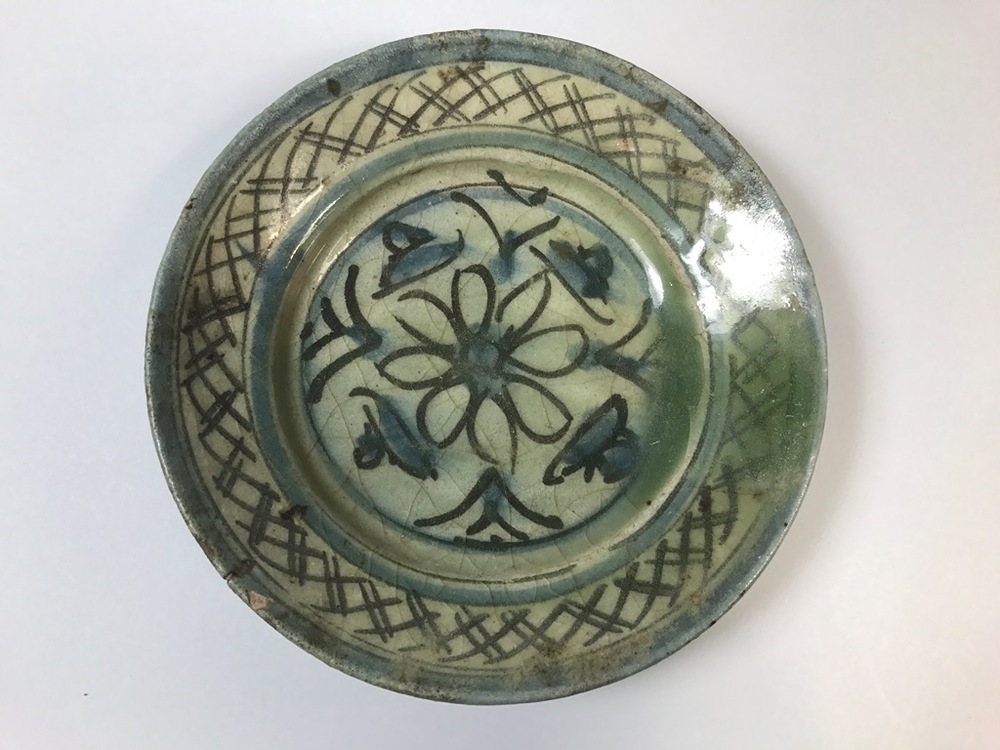 Bord met geometrische en florale decoratie in onderglazuur blauw.||Iran||onbekend||Keramiekmuseum Princessehof MPH 2016-007
