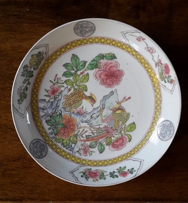 Bord gedecoreerd in het famille rose palet. Op het plat twee fazanten op een rotspartij omgeven door pioenrozen en andere bloemen. Daaromheen een gele band met een geometrisch patroon. Op de rand drie medaillons gevuld met verschillende bloemranken en en drie drakenmedaillons. (Nederlands)