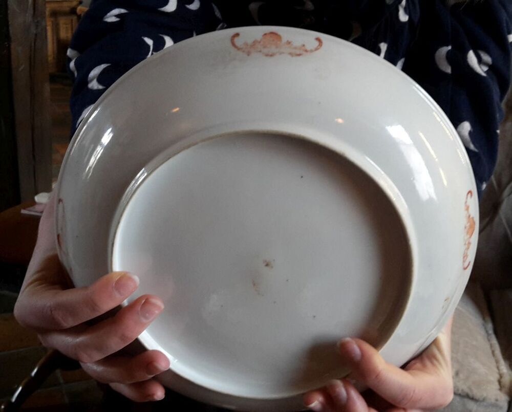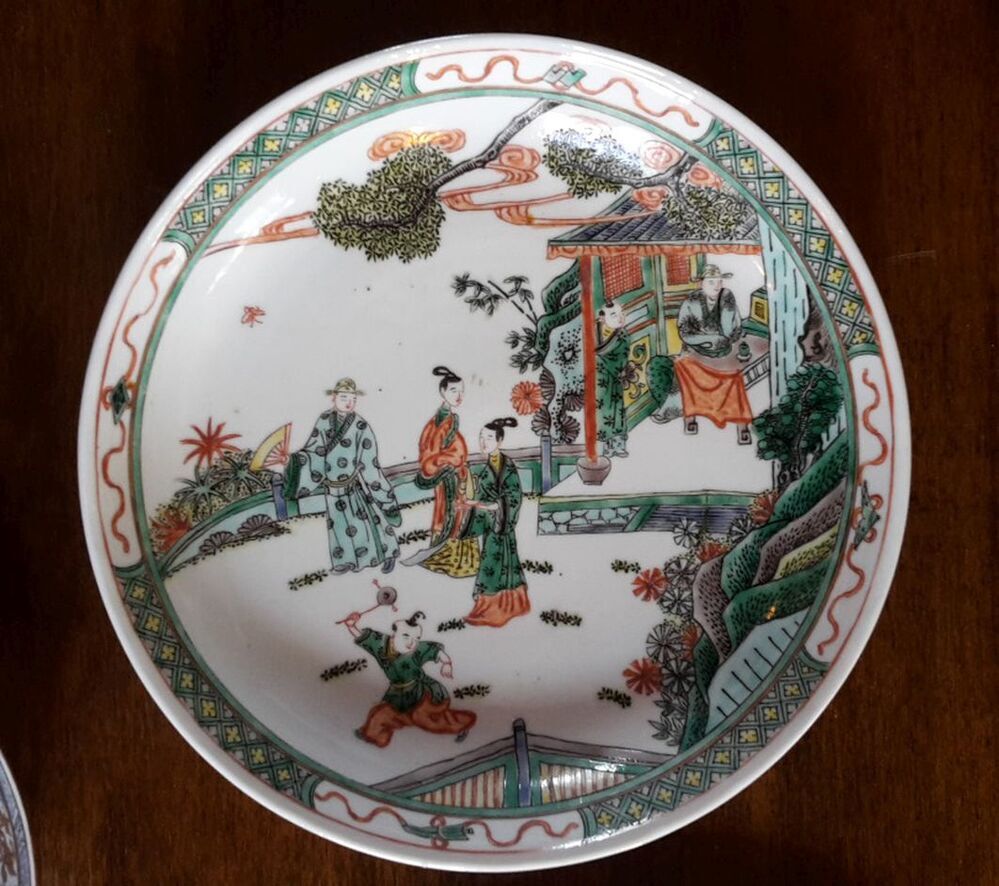 Bord gedecoreerd in het famille verte palet. Op het plat een decoratie van een man, twee vrouwen en een spelende jongen in een tuin. In het tuinpaviljoen zit een man aan een bureau, links van hem staat een jongen. Op de rand een geometrische decoratie afgewisseld met vier medaillons met symbolen van de "honderd antiquiteiten". Op de achterkant van het bord zijn op de rand vier vleermuizen gedecoreerd. Op het midden van het bord zit ook een vleermuis, maar deze is bijna weggevaagd. (Nederlands)