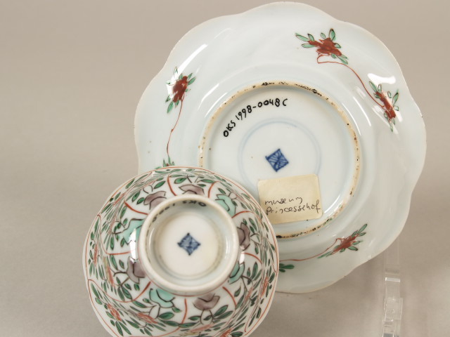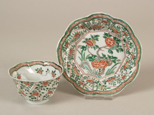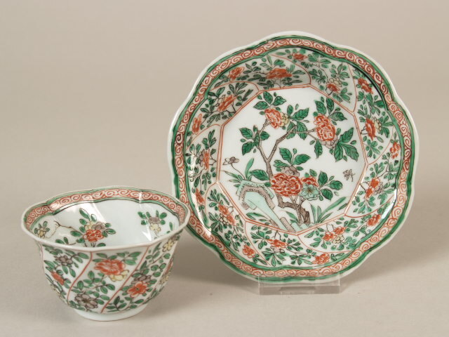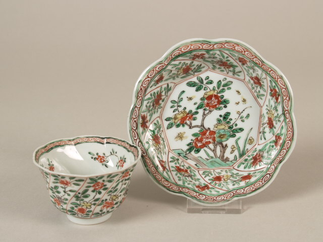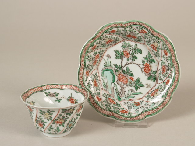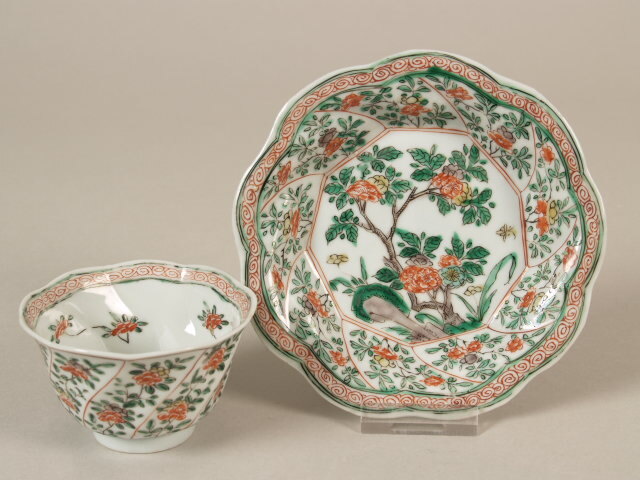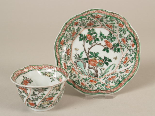 Kop en schotel, onderdeel van een stel van 6 stuks. Op voetring, de wand/ rand is gewelfd door middel van een mal, waarbij schuin weglopende vakken gevormd worden. Famille Verte versierd in emailkleuren. Op het plat een rots en bloeiende planten, in de vakken aan de binnenzijde van de koppen en de achterkanten van de schotels bloemtakjes c.q. bloeiende takken bij een rots. (Nederlands)