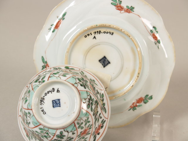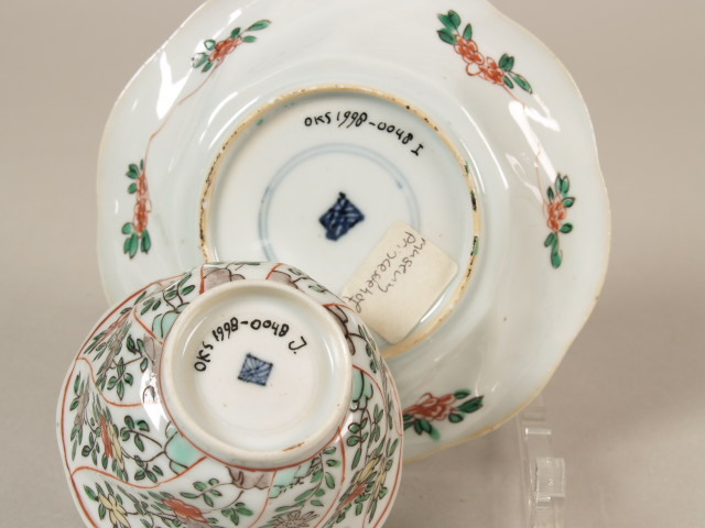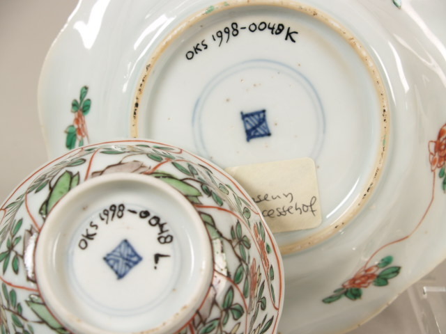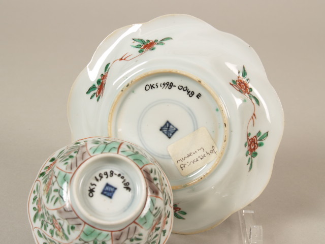Zes stel koppen en schotels met decor van planten en bloemen, famille verte (Q27680)