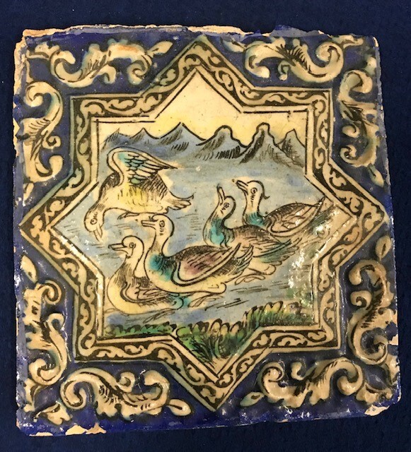 Tegel met een voorstelling van een groep van vijf ganzen. (Nederlands)