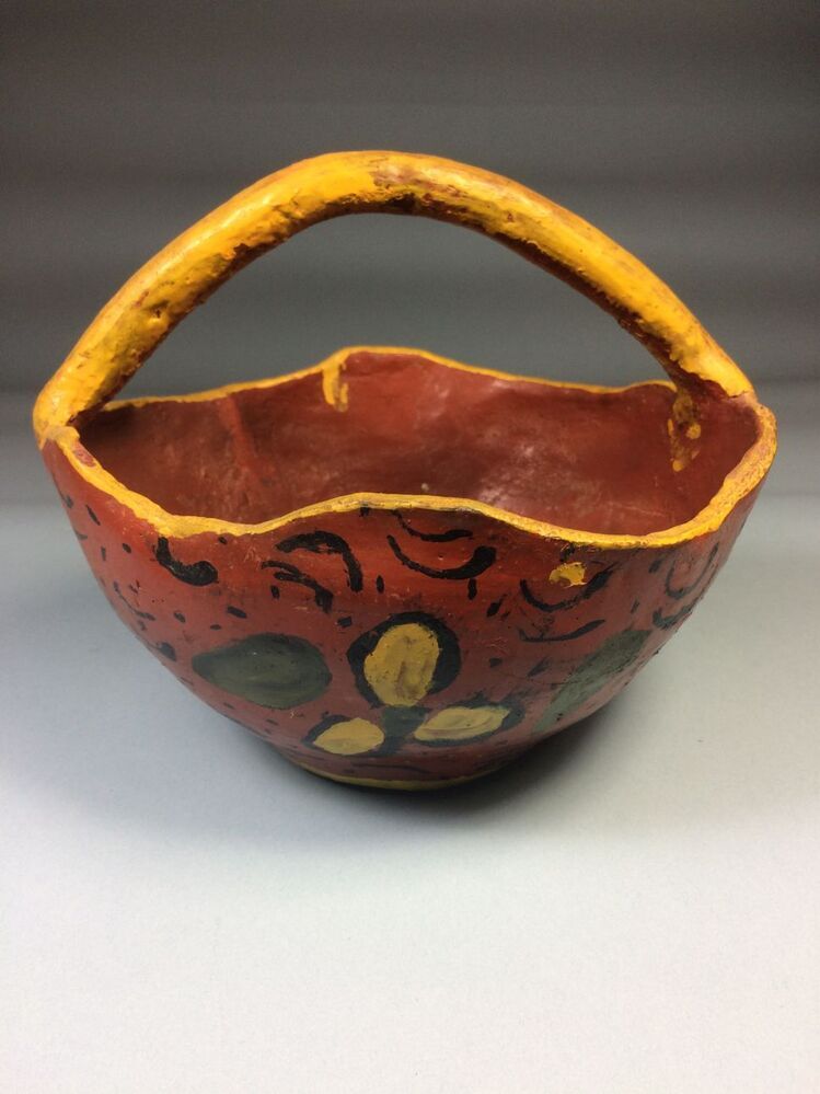 Fruitschaal in de vorm van een hengselbak met versiering in geel, groen en zwart op bruin fond, gevuld met 8 vruchten (Nederlands)