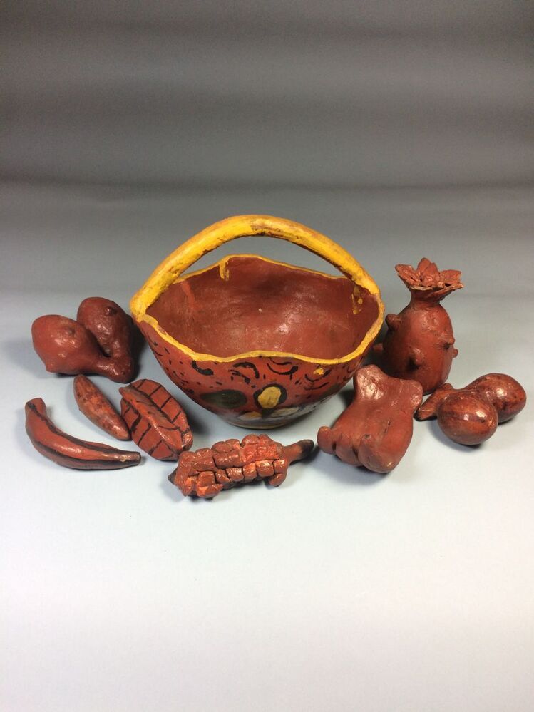 A: Fruitschaal in de vorm van hengselbak, met versiering in geel,groen en zwart op bruin fond. B: Kam van 3 bananen; bruin beschilderd. C: 2 gerekte bolvormige vruchten . uitsteeksels en aan elkaar verbonden, o.a. d.m.v. steel; bruin beschilderd. D: Paprika (?)-achtige vrucht; bruin beschilderd en met zwarte lijnen. E: Geschubde vrucht (maiskolf?); bruin beschilderd met donkere steel. F: Vrucht in de vorm van komkommer(?); bruin beschilderd en met zwarte strepen. G: Vorm als F: met plantensap beschilderd. H; Vorm als C, vruchten aan steel; met plantensap beschilderd. (G en H wijken in materiaal af van de rest en zijn waarschijnlijk later toegevoegd) I: Ananas-achtige vrucht met uitsteeksels; bruin beschilderd. (Nederlands)