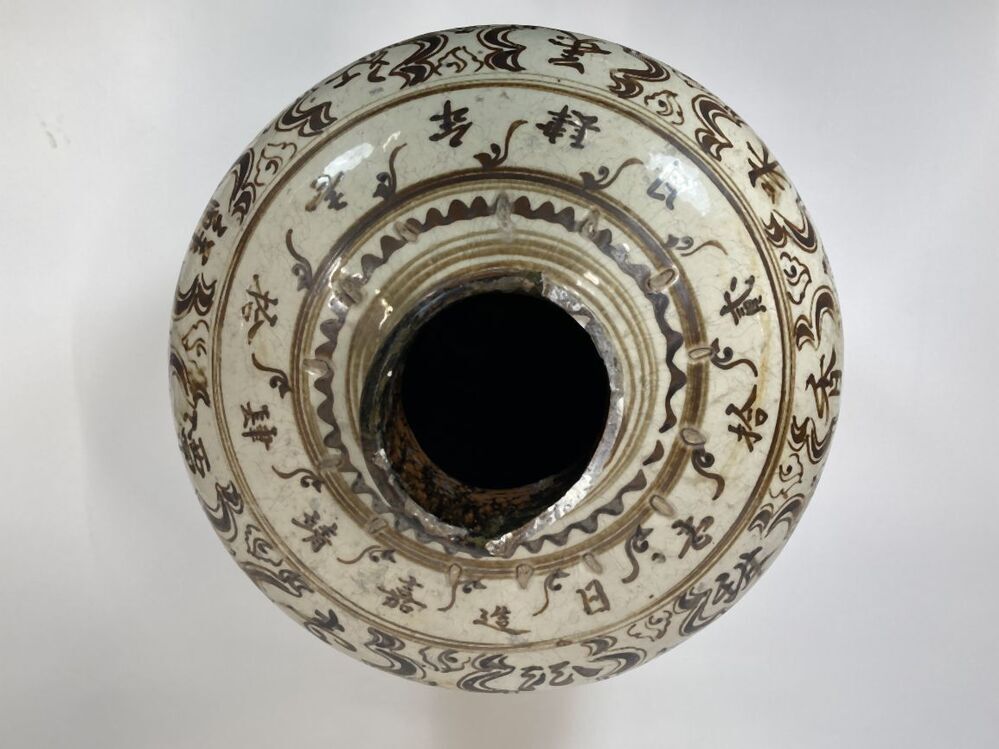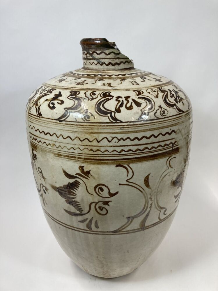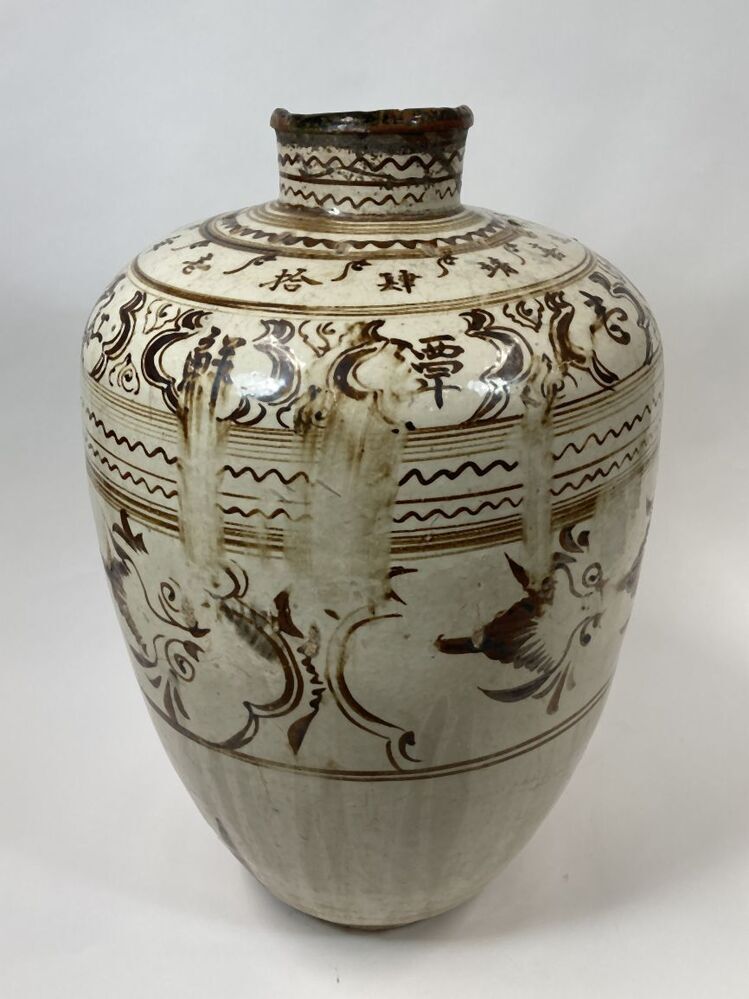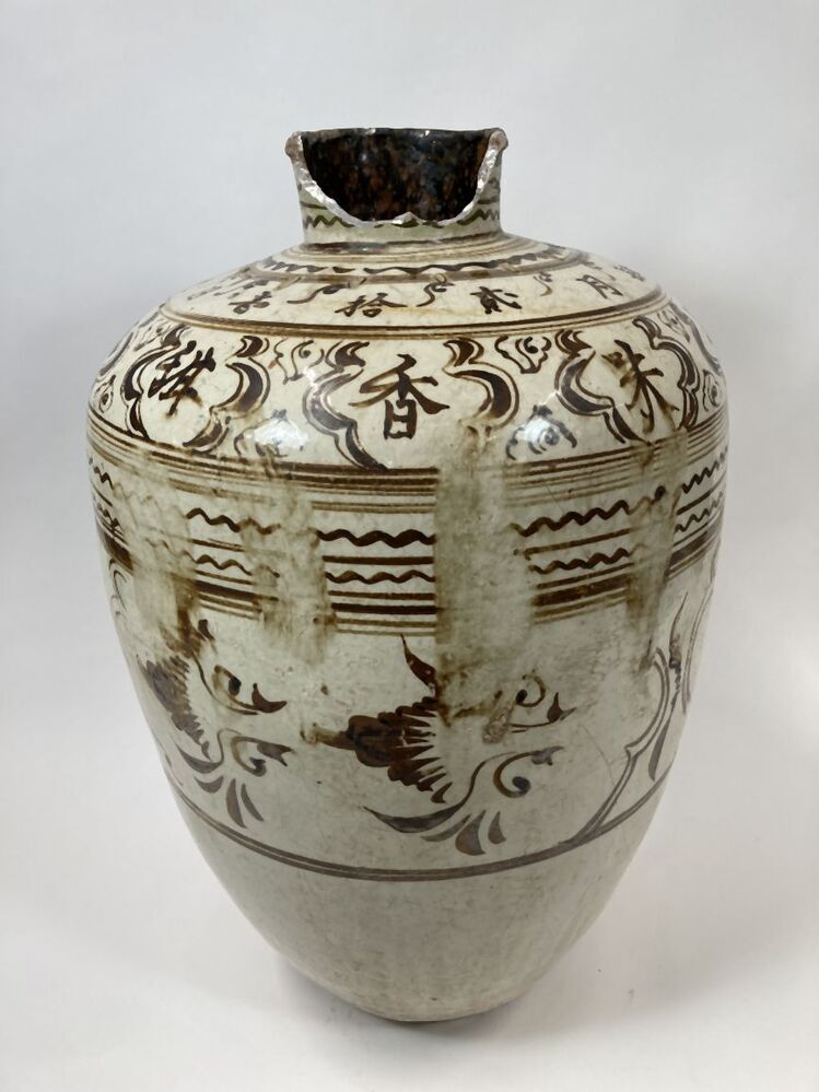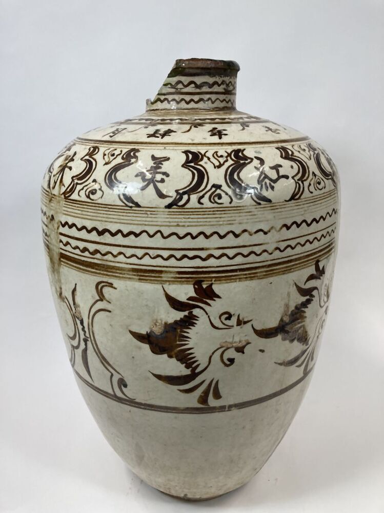 Pot bedekt met witte slib en een decoratie in ijzerbruin pigment verdeeld in verschillende banden. Op de buik zijn cartouches gevuld met een abstracte decoratie, mogelijk vogels? Daarboven enkele horizontale randen in golvende en strakke lijnen. Op de schouders cartouches gevuld met Chinese karakters afgewisseld met abstracte bladmotieven en een band met Chinese karakters. Daarboven en op de nek horizontale randen in golvende en strakke lijnen. Volgens Mikael Jaspers zijn de karakters als volgt te vertalen; Eerste regel (in cartouches): heerlijke, smaakvolle rood gekleurde oude wijn. De tweede regel: gemaakt tijdens de grote Ming dynastie, Jiajing 40ste jaar (1562), 4de maand, 21ste dag. De pot weegt ongeveer 16 kilo en is relatief dun gepot (i.v.m. andere Cizhou-stijl potten). Mogelijk vervaardigd in Huguan. Cizhou-stijl (Nederlands)