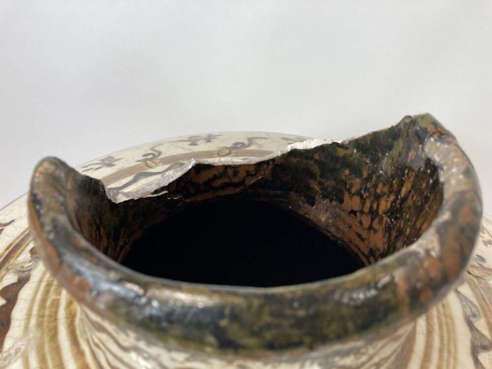 Pot bedekt met witte slib en een decoratie in ijzerbruin pigment verdeeld in verschillende banden. Op de buik zijn carto...u-stijl potten). Mogelijk vervaardigd in Huguan. Cizhou-stijl||China||onbekend||Keramiekmuseum Princessehof MPH 2020-059.A |