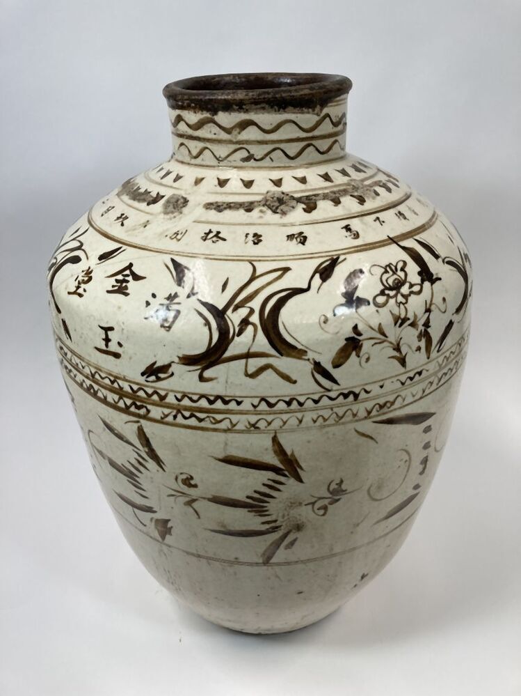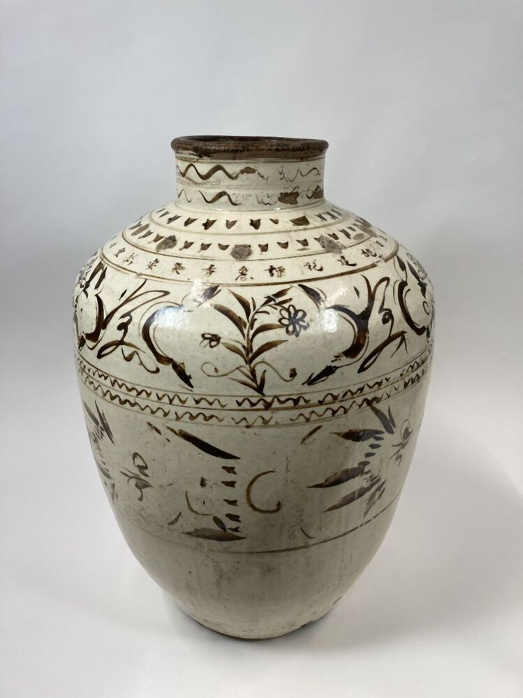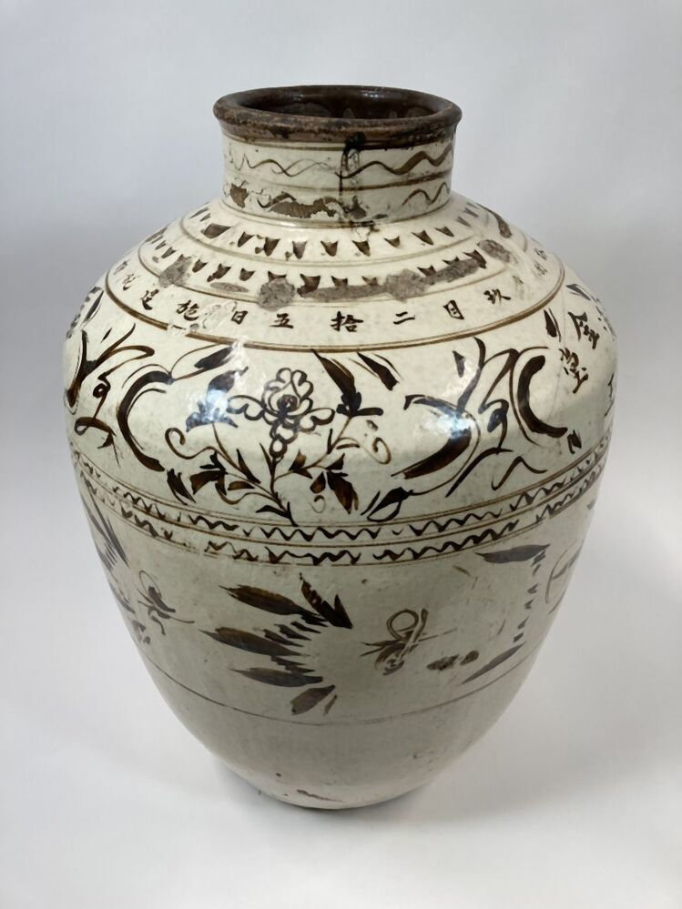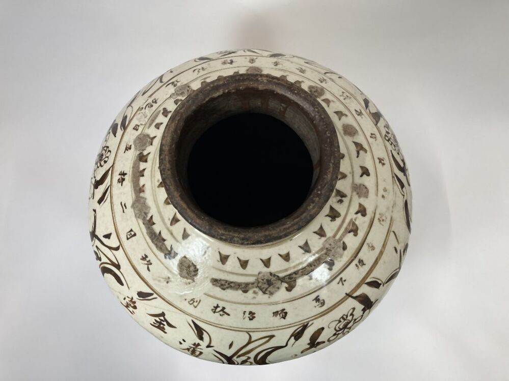 Pot bedekt met witte slib en een decoratie in ijzerbruin pigment verdeeld in verschillende banden. Op de buik een abstracte decoratie. Daarboven enkele horizontale randen in golvende en strakke lijnen. Op de schouders twee cartouches gevuld met bloemen en twee met Chinese karakters afgewisseld met abstracte motieven en een band met Chinese karakters. Daarboven en op de nek horizontale randen in golvende en strakke lijnen. Volgens Mikael Jaspers zijn de karakters als volgt te vertalen; Eerste regel (in cartouches): Huis vol van goud en jade / Spring op het paard wanneer je de aroma (van wijn) ruikt. De tweede regel: Shunzhi 18de jaar (1661), 9de maand, 25ste dag, stuur deze wijnpot (als een geschenk), welke elegant en wit als sneeuw is. De pot weegt ongeveer 25 kilo en daarmee relatief zwaarder dan vergelijkbare potten. Cizhou-stijl (Nederlands)