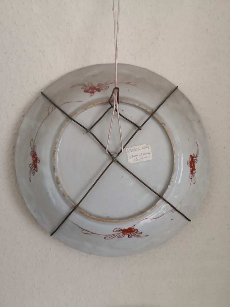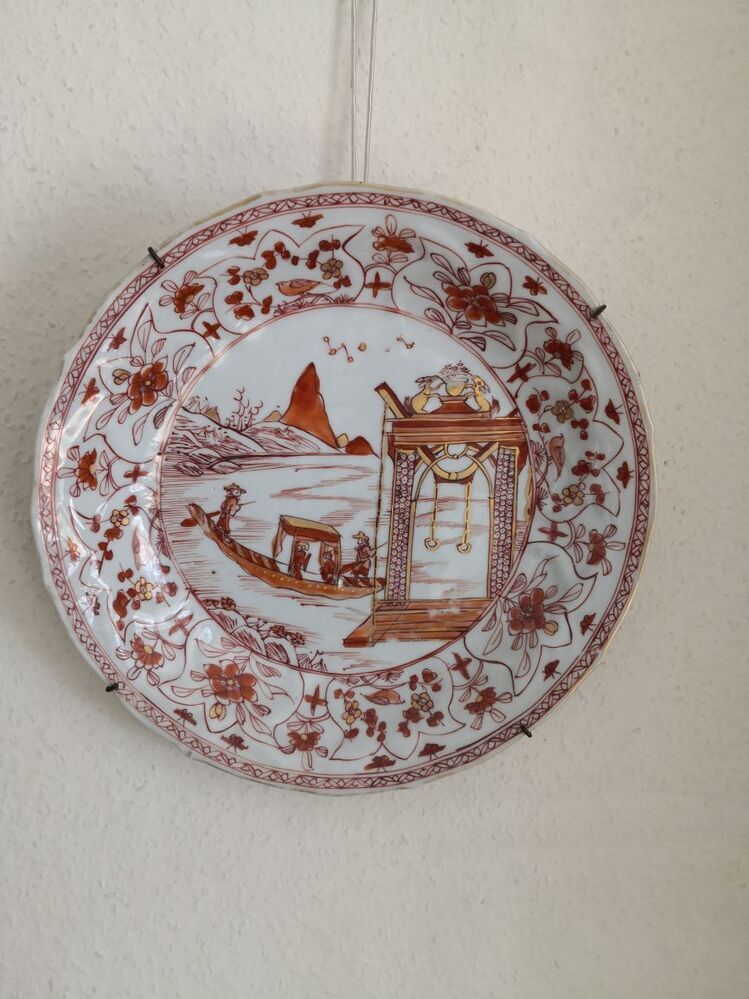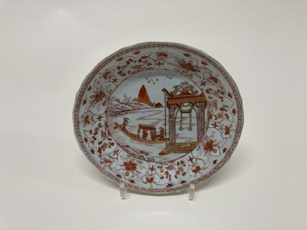 Bord beschilderd op het glazuur in rood en goud. Op het plat een waterlandschap waarin bergen, een boot met vier personen en een ophaalbrug zijn afgebeeld. Bovenop de brug staat een vaas met aan weerszijden twee konijnen. De decoratie van de brug is waarschijnlijk gebaseerd op een Europese prent. Op de wand tulpvormige vakken met bloemtakken of vogels op een bloementak, tussen de vakken bloemen en inscecten; op de rand een decoratieve band. Op de achterzijde zijn op de wand vier bloemranken aangebracht. Melk en bloed. (Nederlands)