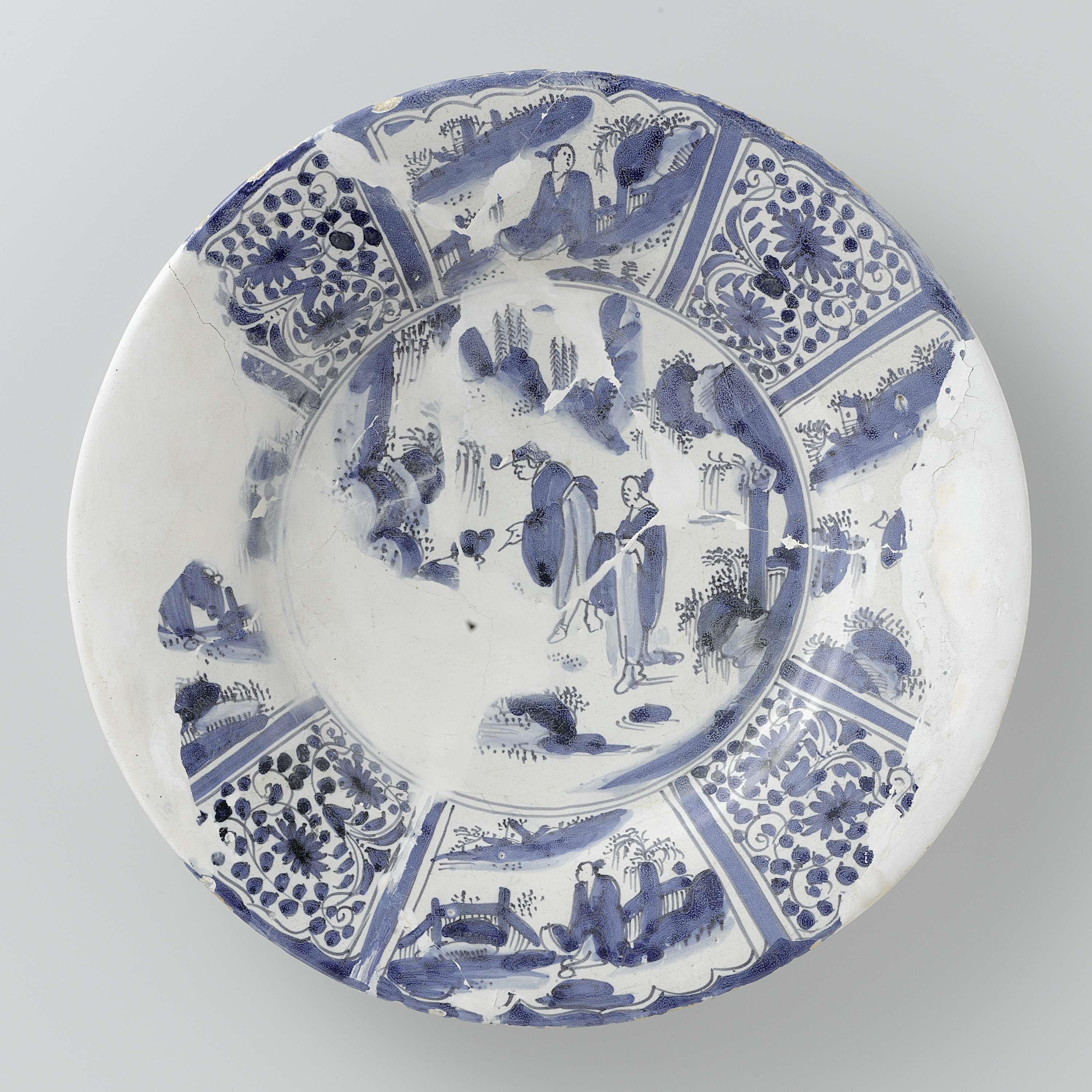 fragmentarische schotel, het plat in blauw beschilderd met chinoiserieën. Rand met Wan Li decor (Nederlands)