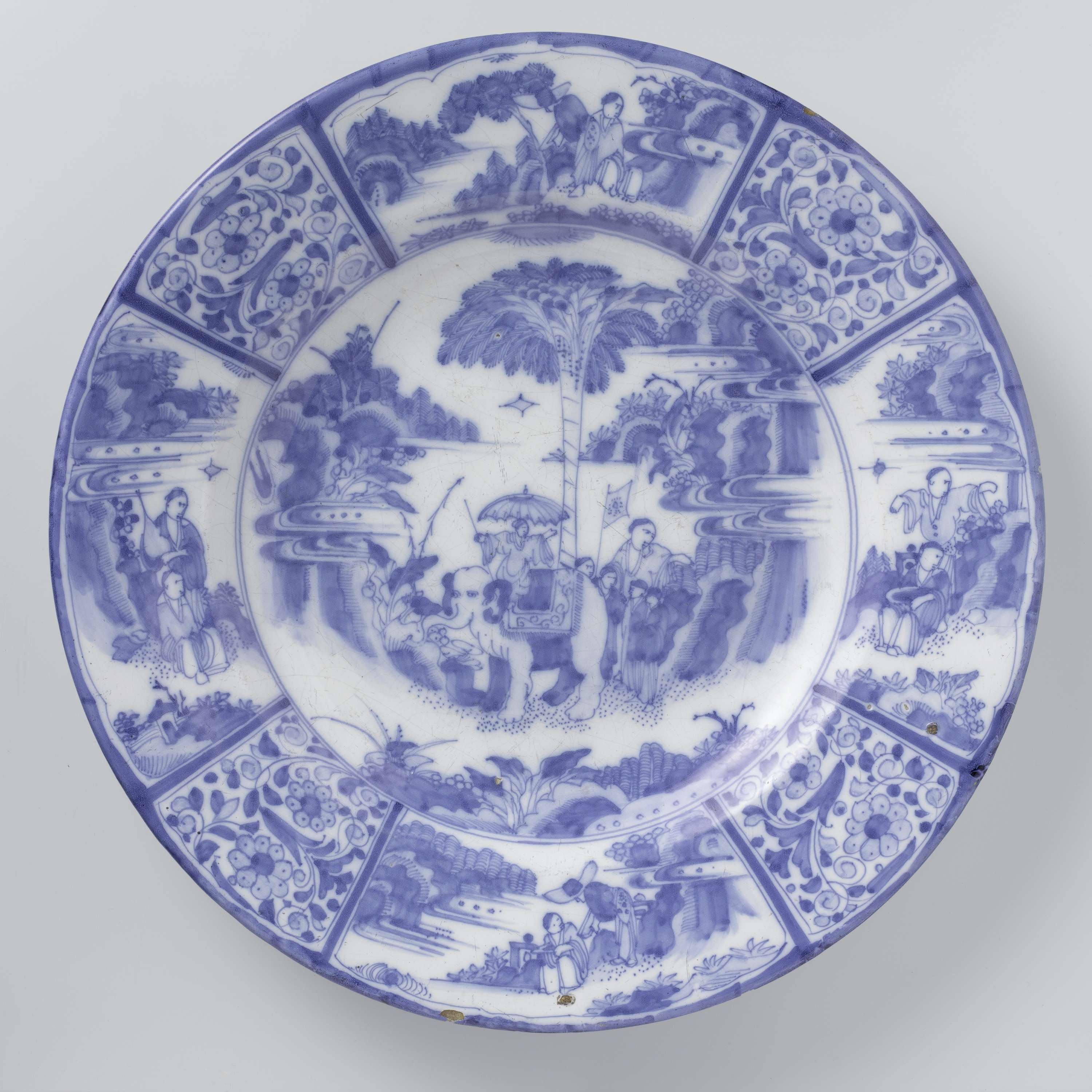 Ronde schotel van blauw beschilderde faience, met op het plat een optocht met een olifant in een landschap. De rand is verdeeld in vakken. Vier vakken met daarin twee zittende figuren in een landschap, worden afgewisseld met vier vakken met daarin bloemmotieven. (Nederlands)
