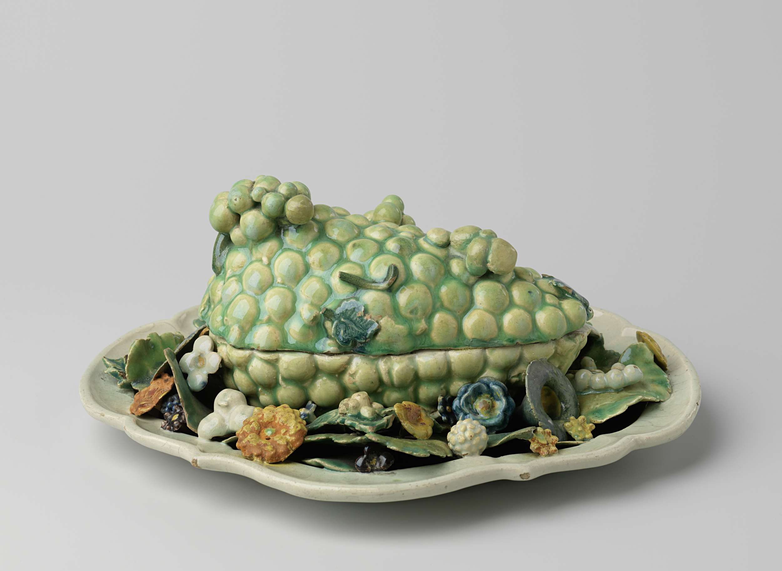 Botervloot van veelkleurig beschilderde faience. De botervloot heeft de vorm van een witte druiventros, liggend op een bed van bloemen en bladeren op een schaal. De botervloot heeft een deksel en een binnenbak. De deksel en de bak zijn gemerkt. (Nederlands)