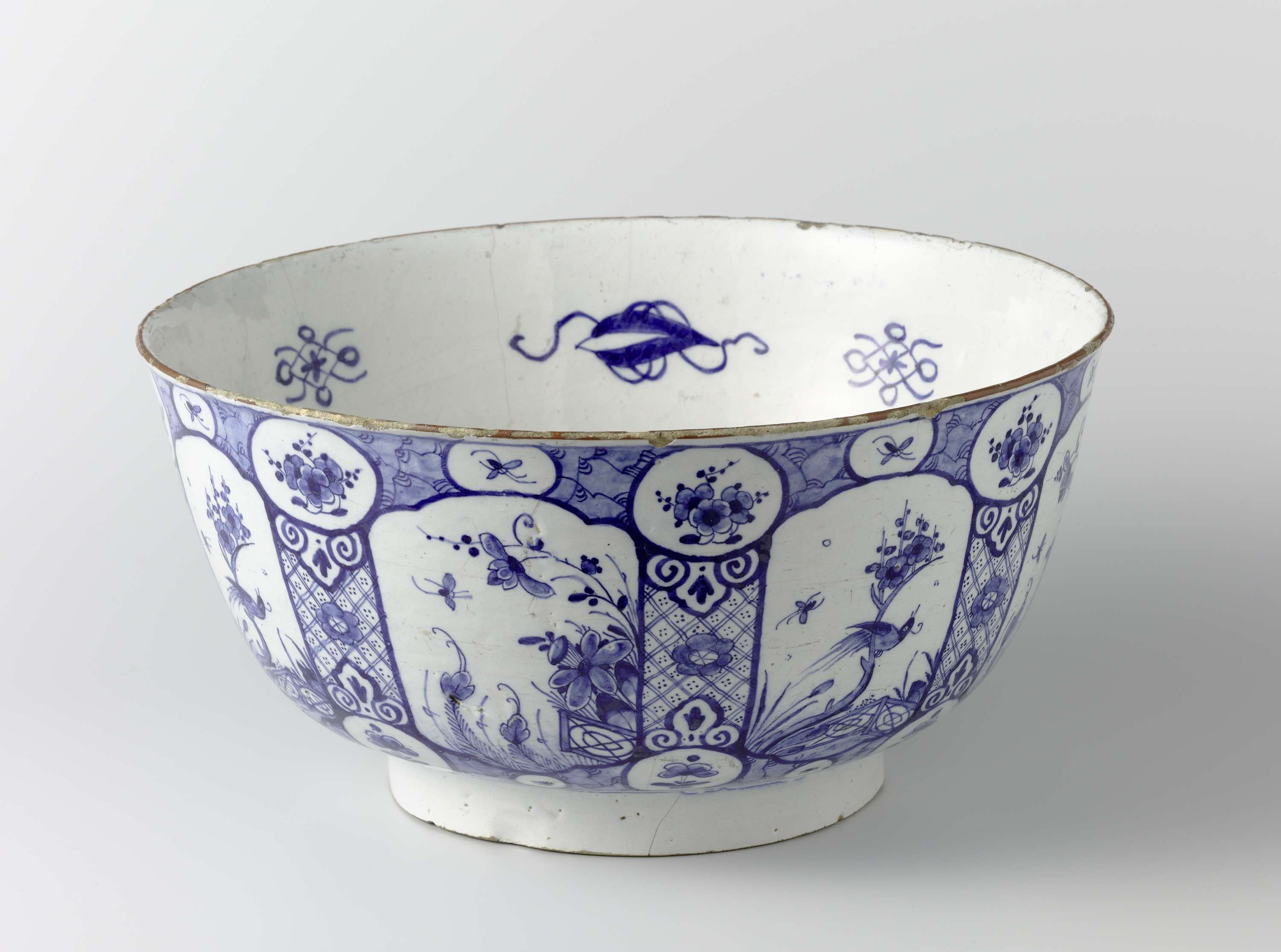 Ronde, half bolvormige kom op een standring, van veelkleurig beschilderde faience. De wand is aan de buitenkant verdeeld in acht vakken met daarin bloemen en planten. Tussen de vakken is een ruitmotief geschilderd en in de bovenrand zijn acht ovalen met bloemen en acht kleinere ovalen met insekten geschilderd. Binnen op de bodem van de kom een blad en linten. De kom is gemerkt: AK. (Nederlands)