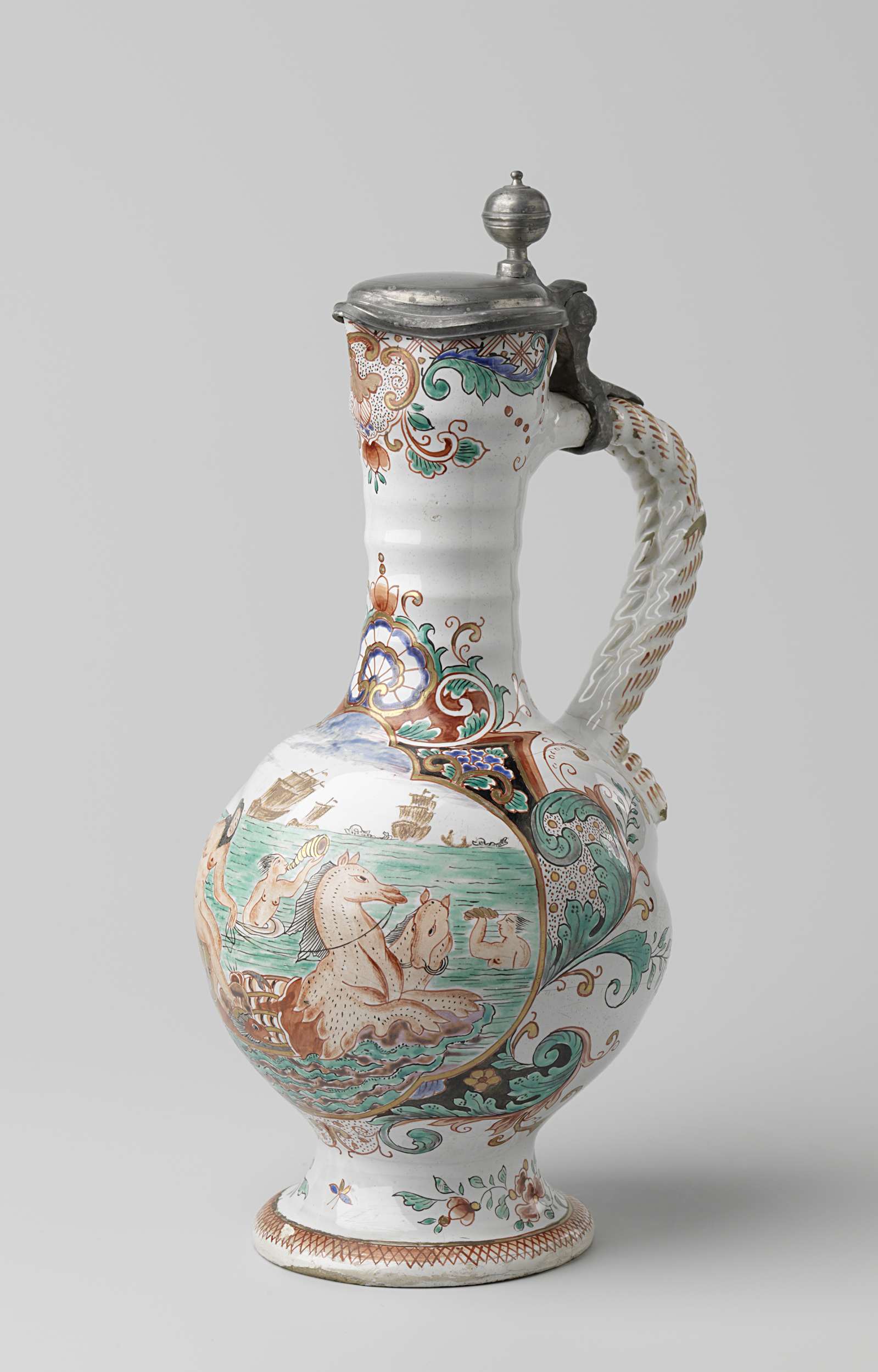 Schenkkan, veelkleurig beschilderd met Neptunus op de buik (Q27788)