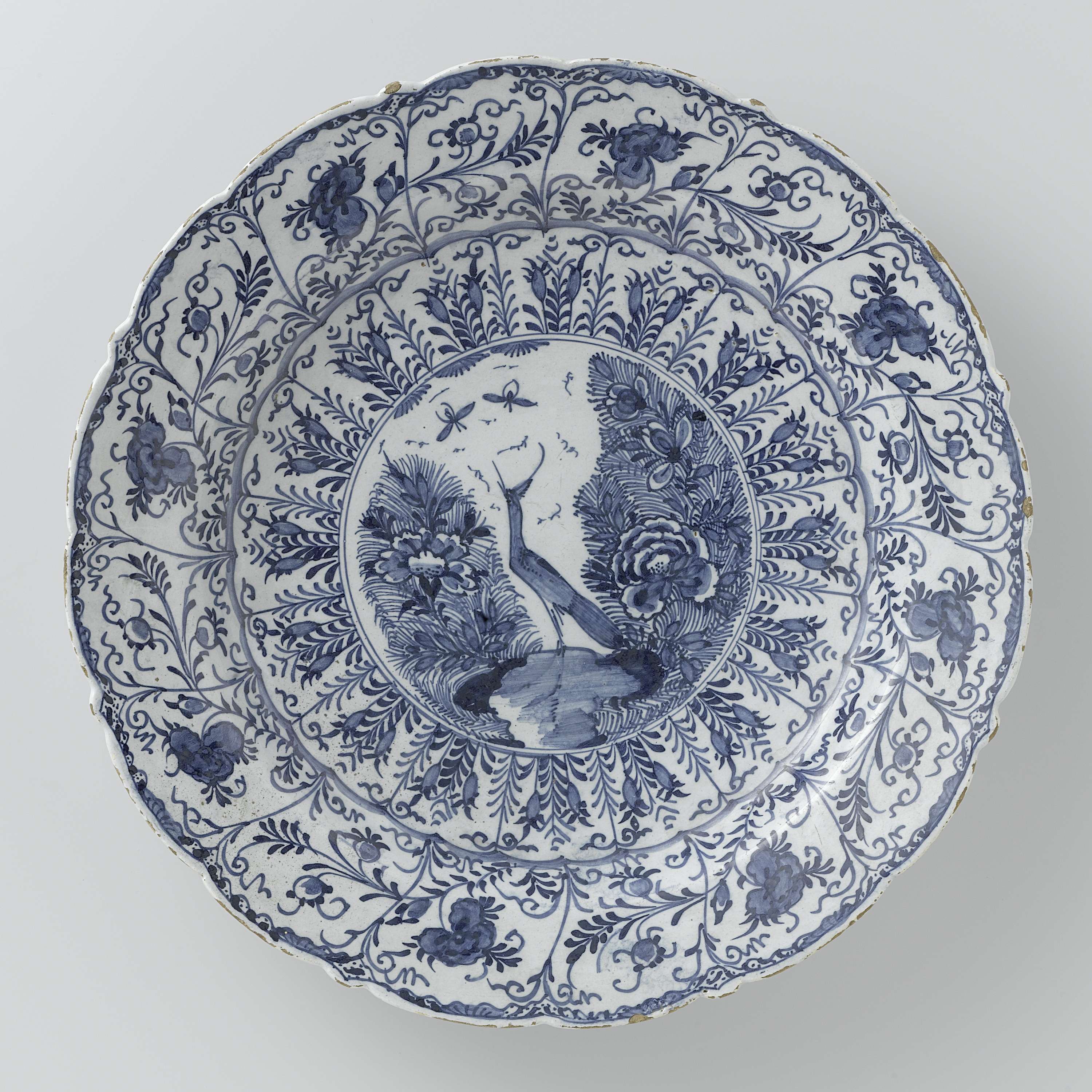 Ronde schotel van blauw beschilderde faience, met een geschulpte rand. Op het plat is een vogel (reiger ?) tussen bloemen geschilderd en op de rand bloemen- en bladerranken. De schotel is gemerkt: P en P<. De schotel is in 1967 in bruikleen gegeven aan het Historisch Museum in Venlo. Bij de schotel horen vier identieke exemplaren met invnrs. BK-NM-13285-b, BK-NM-13285-c, BK-NM-13285-d en BK-NM-13285-e. (Nederlands)