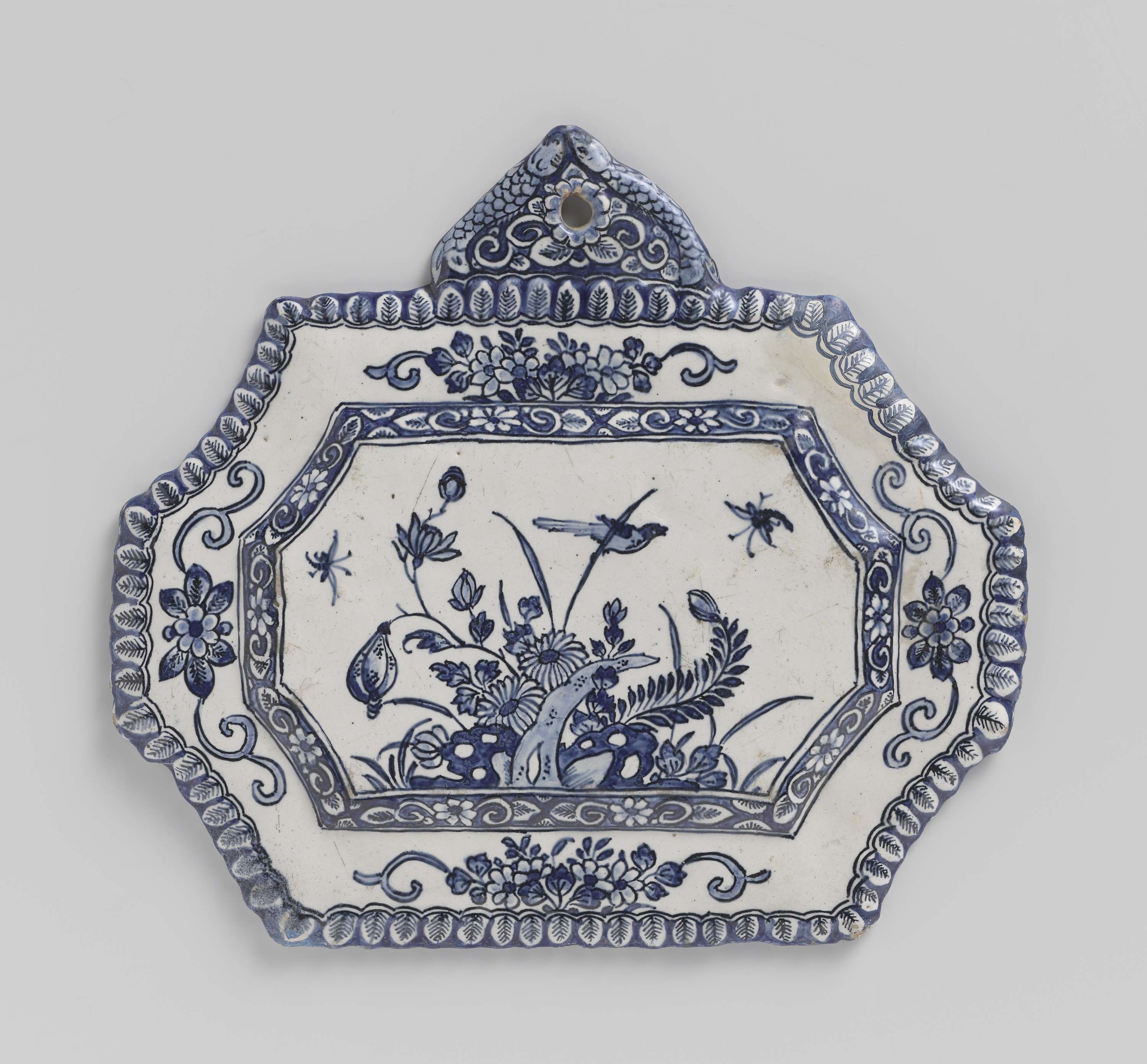 Langwerpige, achthoekige plaat van blauw beschilderde faience. De bovenrand heeft een driehoekig fronton met een draagoog. In het midden zijn bloemen, planten, vogels en vlinders geschilderd. Op de rand zijn bloemen geschilderd. (Nederlands)