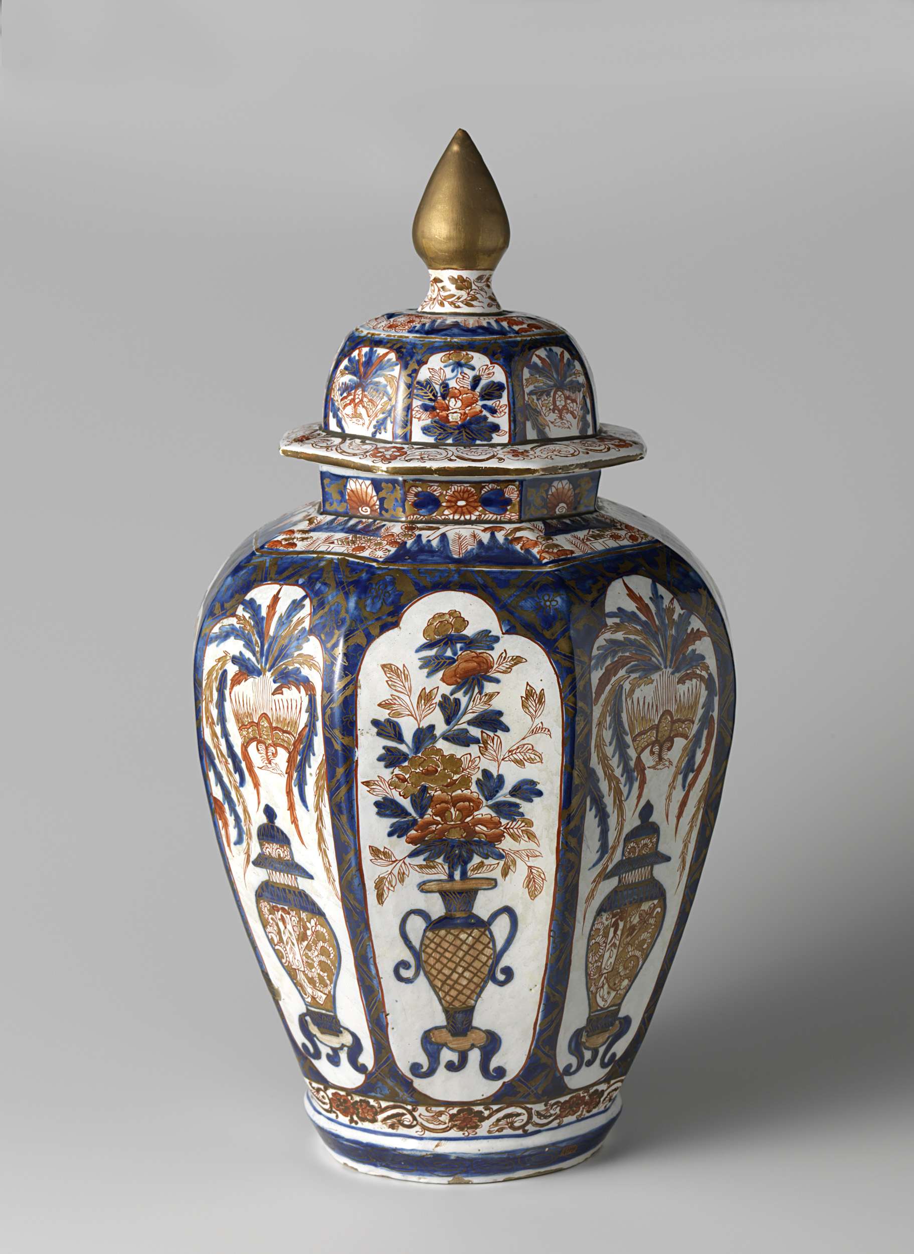 Pot met deksel, van veelkleurig beschilderde faïence. De pot is achtkantig en op de acht kanten zijn acht vakken geschilderd. In vier vakken is een vaas met twee s-vormige handvatten, staand op een driepotig voetstuk en gevuld met bloemen geschilderd, in de andere vier vakken een pot met deksel op een driepotig voetstuk waarboven een feniks. De pot is gemerkt en is onderdeel van een stel. (Nederlands)