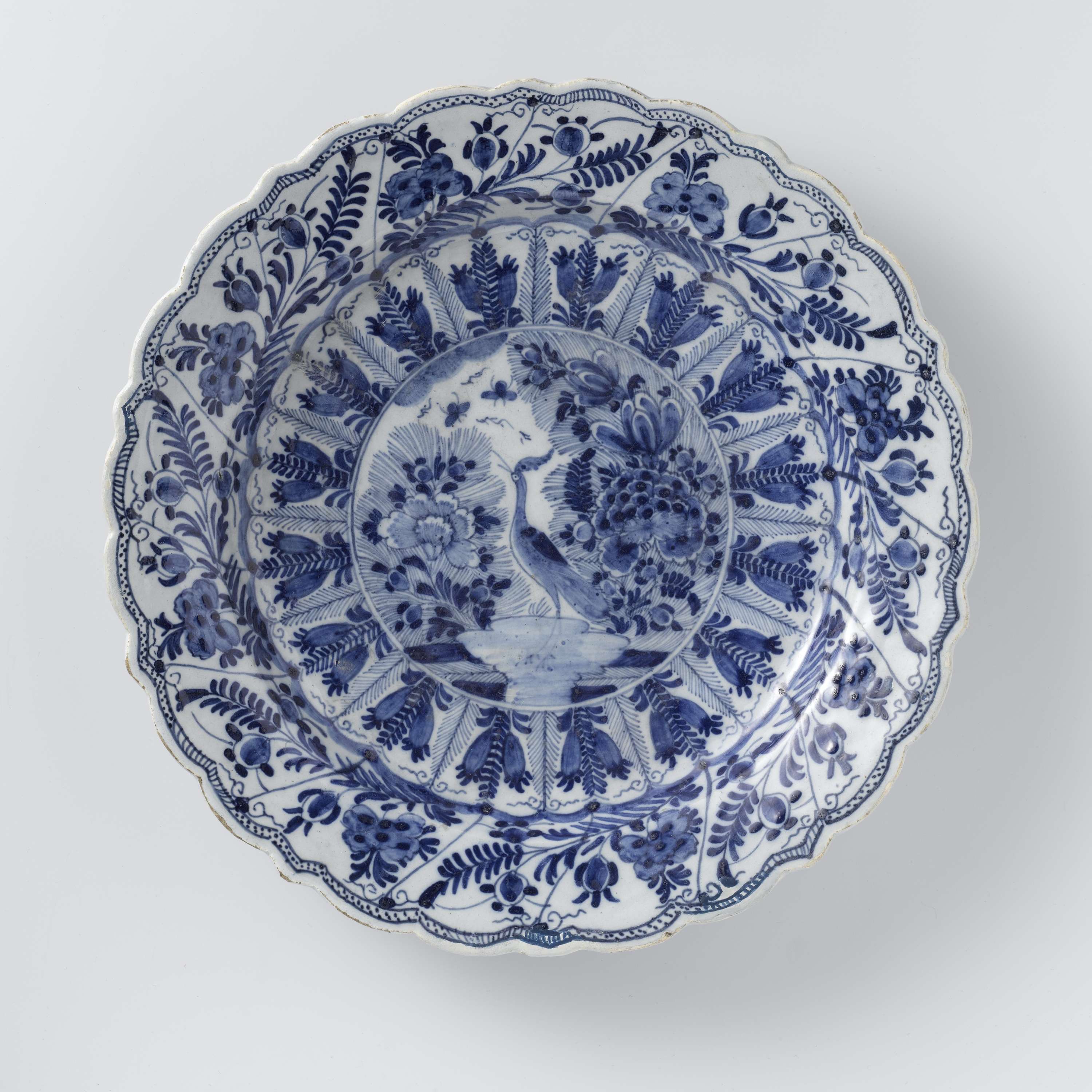 Ronde schotel van blauw geschilderde faience, met een geschulpte rand en versierd met het reigerpatroon. De schotel is gemerkt: LP kan Delft Fabr. Bij de schotel horen zes identieke schotels met invnrs. BK-NM-13284-a, BK-NM-13284-b, BK-NM-13284-d, BK-NM-13284-e, BK-NM-13284-f en BK-NM-13284-g. (Nederlands)