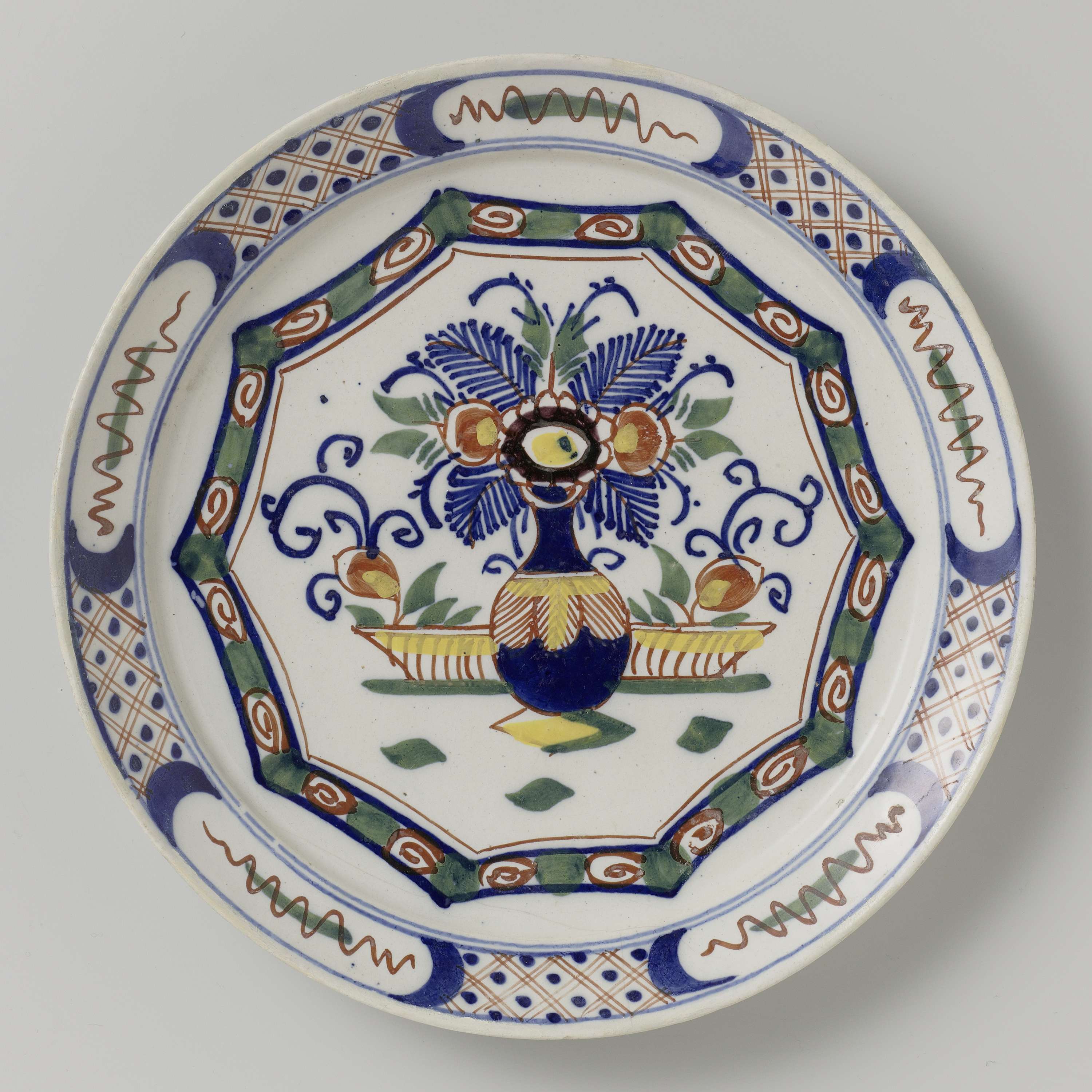 Rond bord van veelkleurig beschilderd faience, met op het plat een vaas met bloemen voor een schaal met bloemen in de kleuren groen, rood, blauw en geel en daar omheen een tienhoekige rand in de kleuren groen en rood. Op de rand van het bord is een Chinees motief geschilderd. Bij het bord horen twee identieke borden met invnrs. BK-KOG-2427-a en BK-KOG-2427-c. (Nederlands)