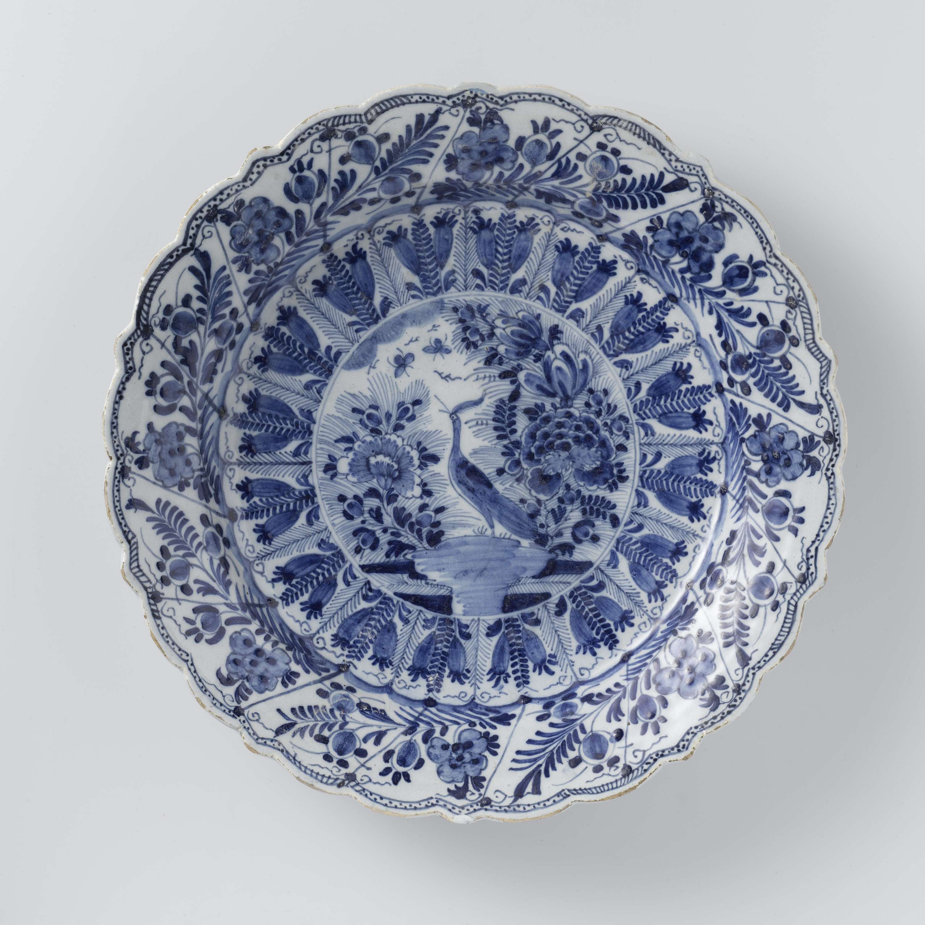 Ronde schotel van blauw geschilderde faience, met een geschulpte rand en versierd met het reigerpatroon. De schotel is gemerkt: LP kan Delft Fabr. Bij de schotel horen zes identieke schotels met invnrs. BK-NM-13284-a, BK-NM-13284-b, BK-NM-13284-c, BK-NM-13284-d, BK-NM-13284-f en BK-NM-13284-g. (Nederlands)
