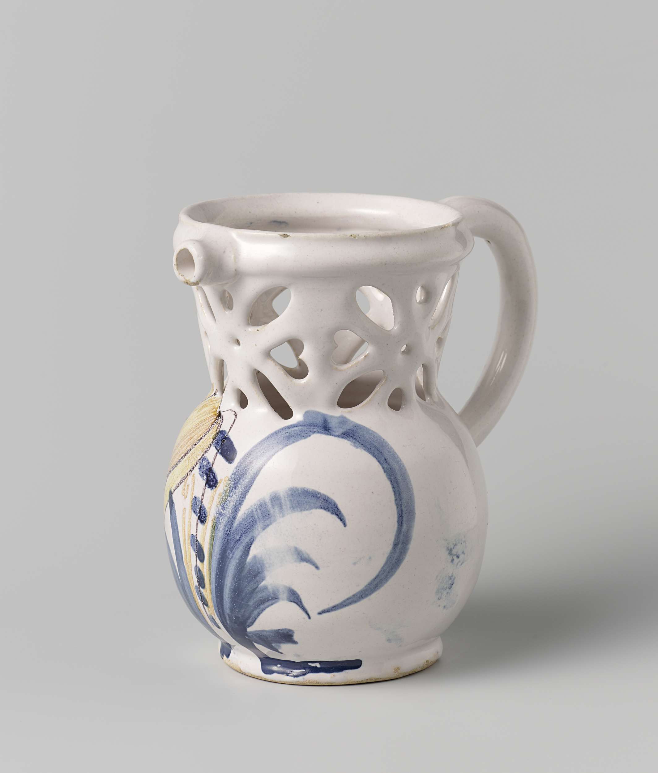 Fopkan van veelkleurig beschilderde faience. Op de kan is een bloem geschilderd (tulp). De kan heeft een oor en een schenktuit. (Nederlands)