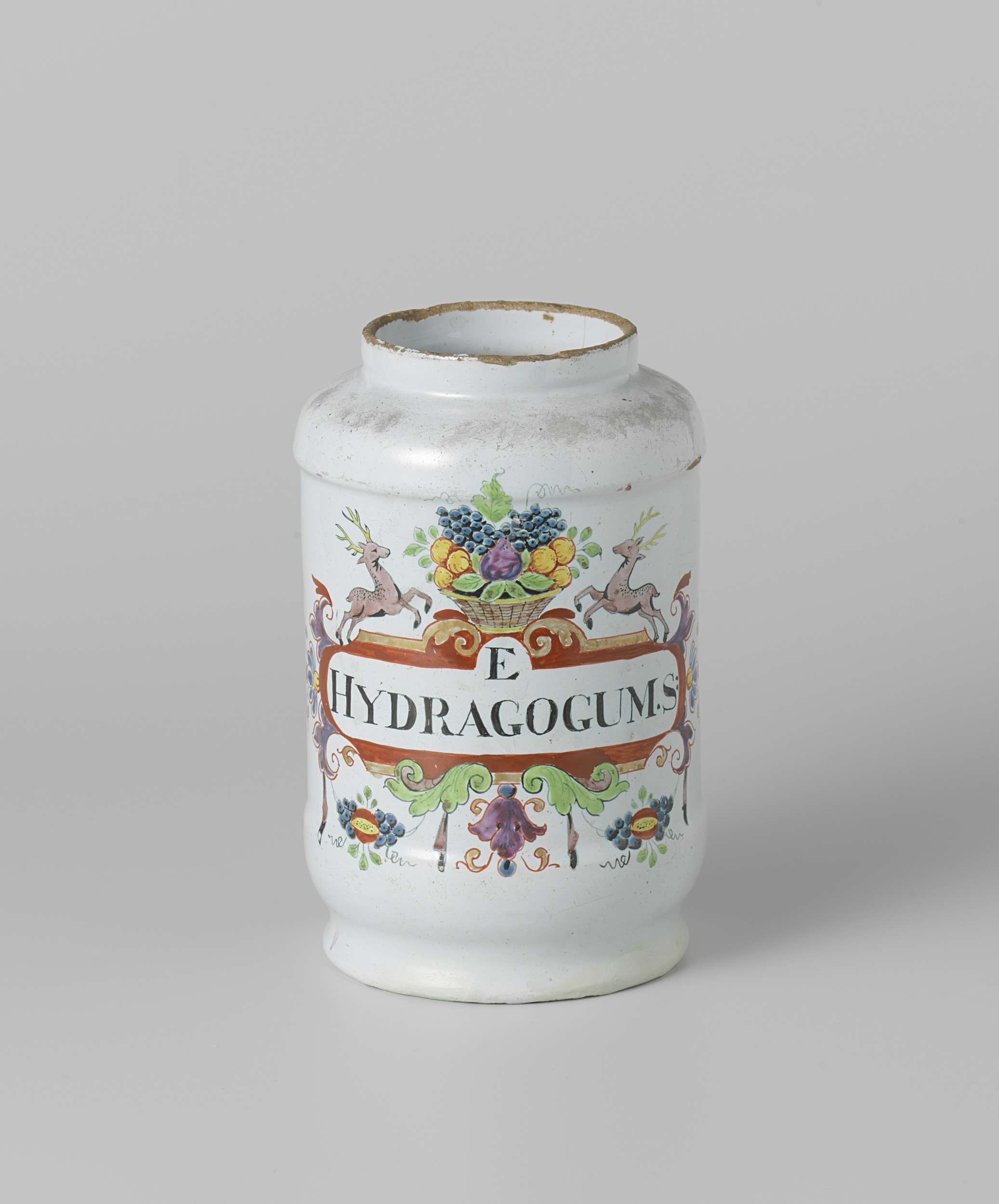 Een apothekerspot van veelkleurig beschilderde faience, zonder deksel. De pot heeft een cartouche met opschrift: E HYDRAGOGUM.S. en is beschilderd met bloemenguirlandes, herten en een mand met vruchten. Bij de pot hoort een apothekerspot met invnr. BK-NM-10612-b. (Nederlands)