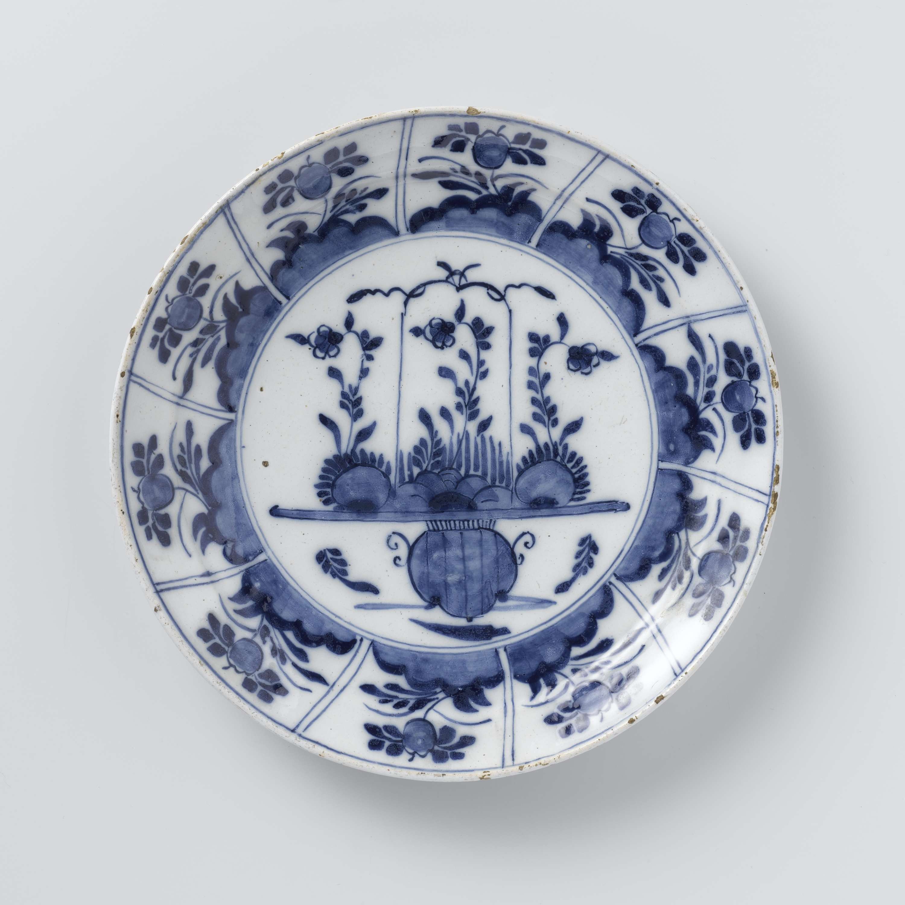 Rond bord van blauw beschilderde faience, met op het plat een tafel met bloemen. De rand is verdeeld in tien vakken met in elk vak een plant op een grond. (Nederlands)