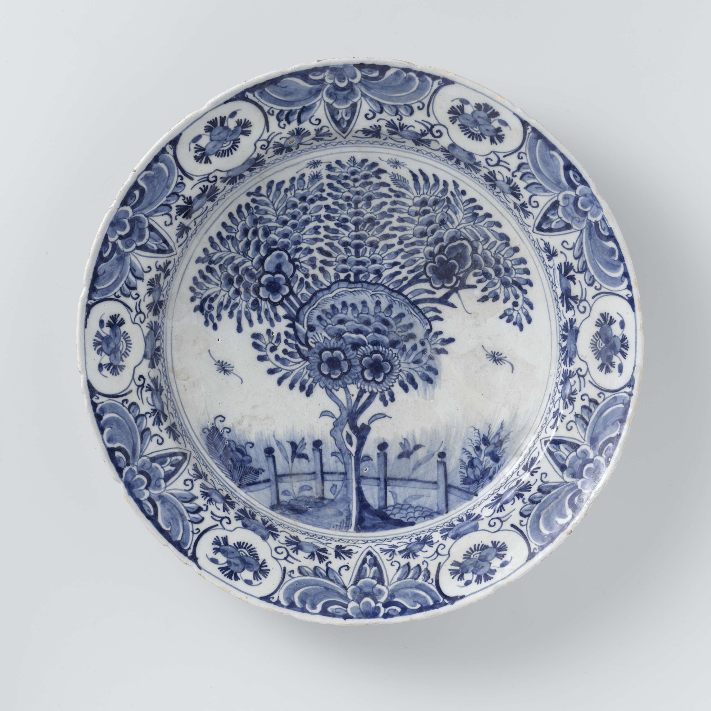 Ronde schotel van blauw beschilderde faience. Op het plat is een boom (theeboom ?) voor een hek geschilderd en op de rand bloemmotieven. De schotel is gemerkt met het merk van de plateelbakkerij De Grieksche A. Bij de schotel horen vier identieke schotels met invnrs. BK-NM-13291-a, BK-NM-13291-b, BK-NM-13291-c en BK-NM-13291-e. (Nederlands)