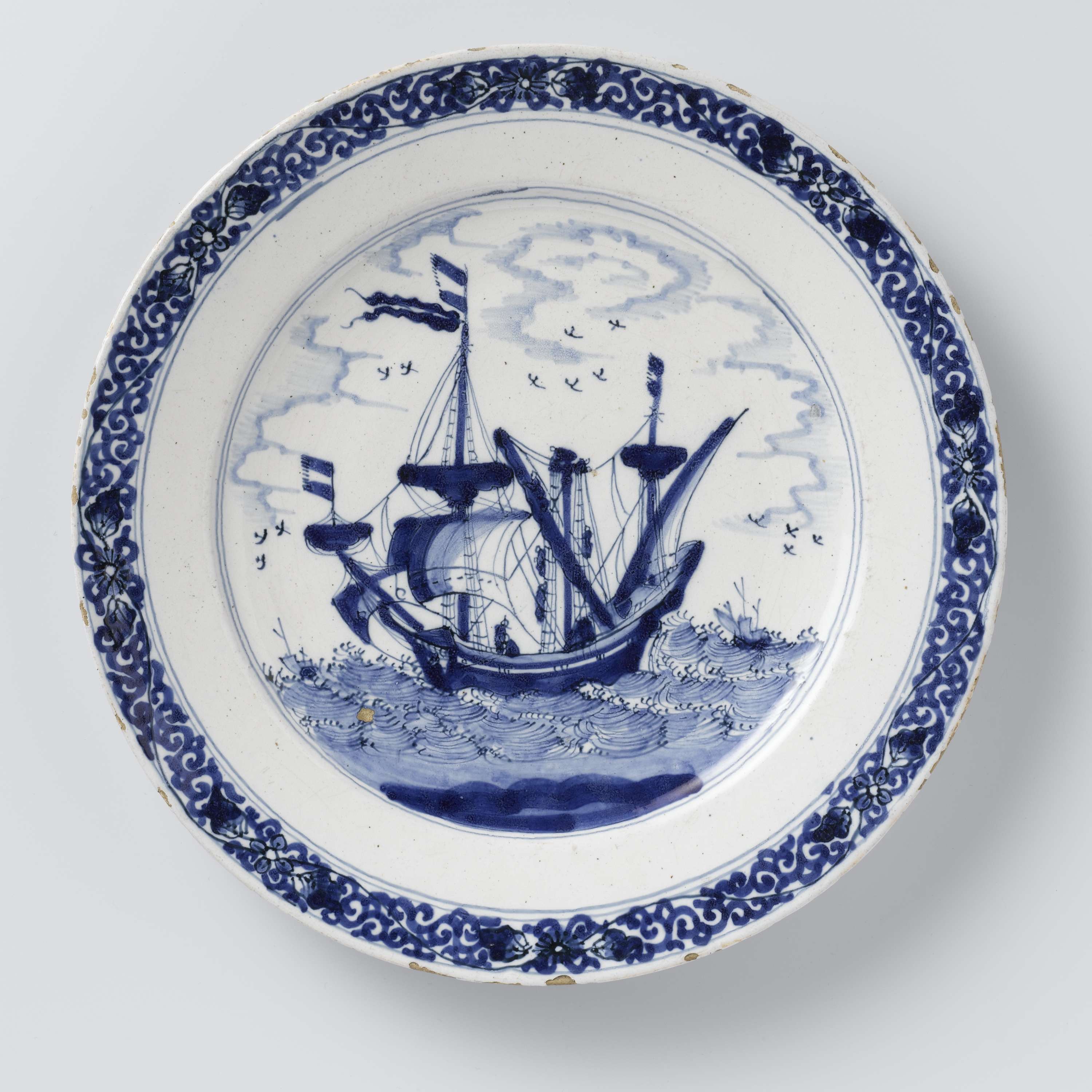 Rond bord van blauw beschilderde faience, met op het plat vier zeilende schepen. Bij het bord horen drie identieke borden met de invnrs. BK-NM-11168-a, BK-NM-11168-c en BK-NM-11168-d. (Nederlands)