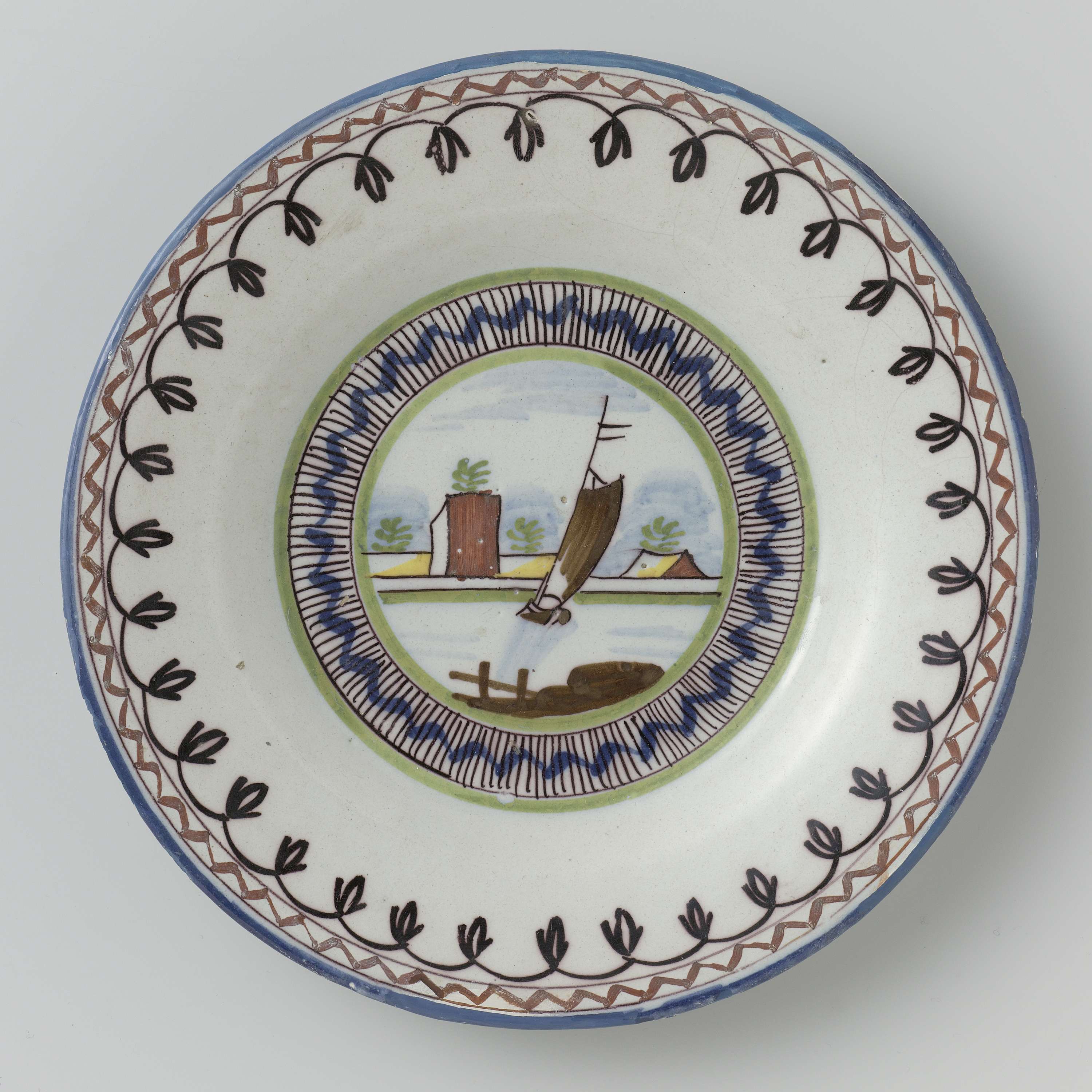 Rond bord van veelkleurig beschilderde faience, met op het plat een zeilende boot en een landschap. Bij het bord hoort een identiek bord met invnr. BK-NM-4226. (Nederlands)