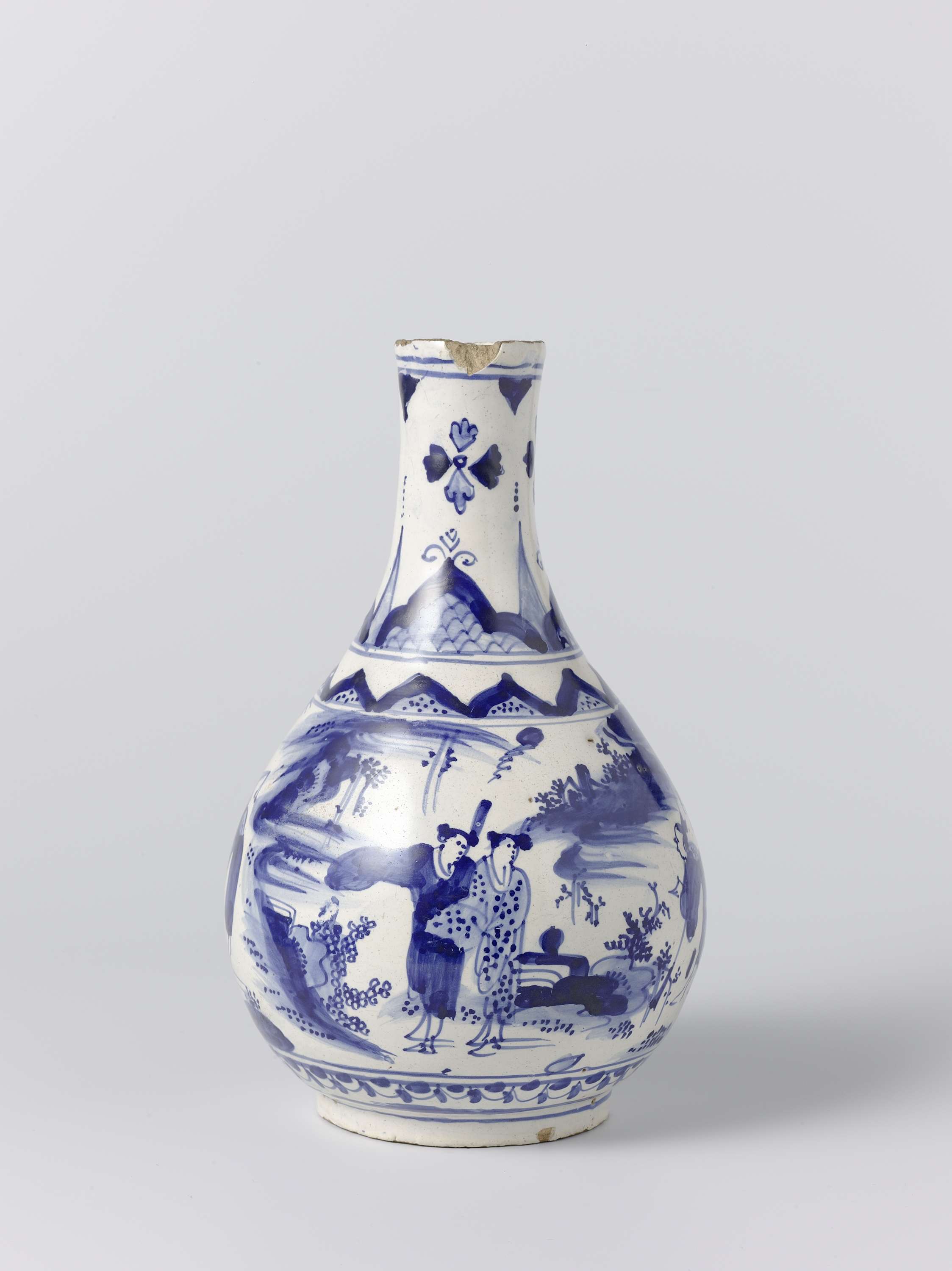 Vaas van blauw beschilderde faience. De vaas heeft een bolle buik en heeft een smal toelopende hals. Op de buik is een landschap met figuren (Chinezen) geschilderd en op de hals puntmotieven en gestileerde bloemen. Langs de voet loopt een rand met geometrische ornamenten. De vaas is gemerkt. (Nederlands)
