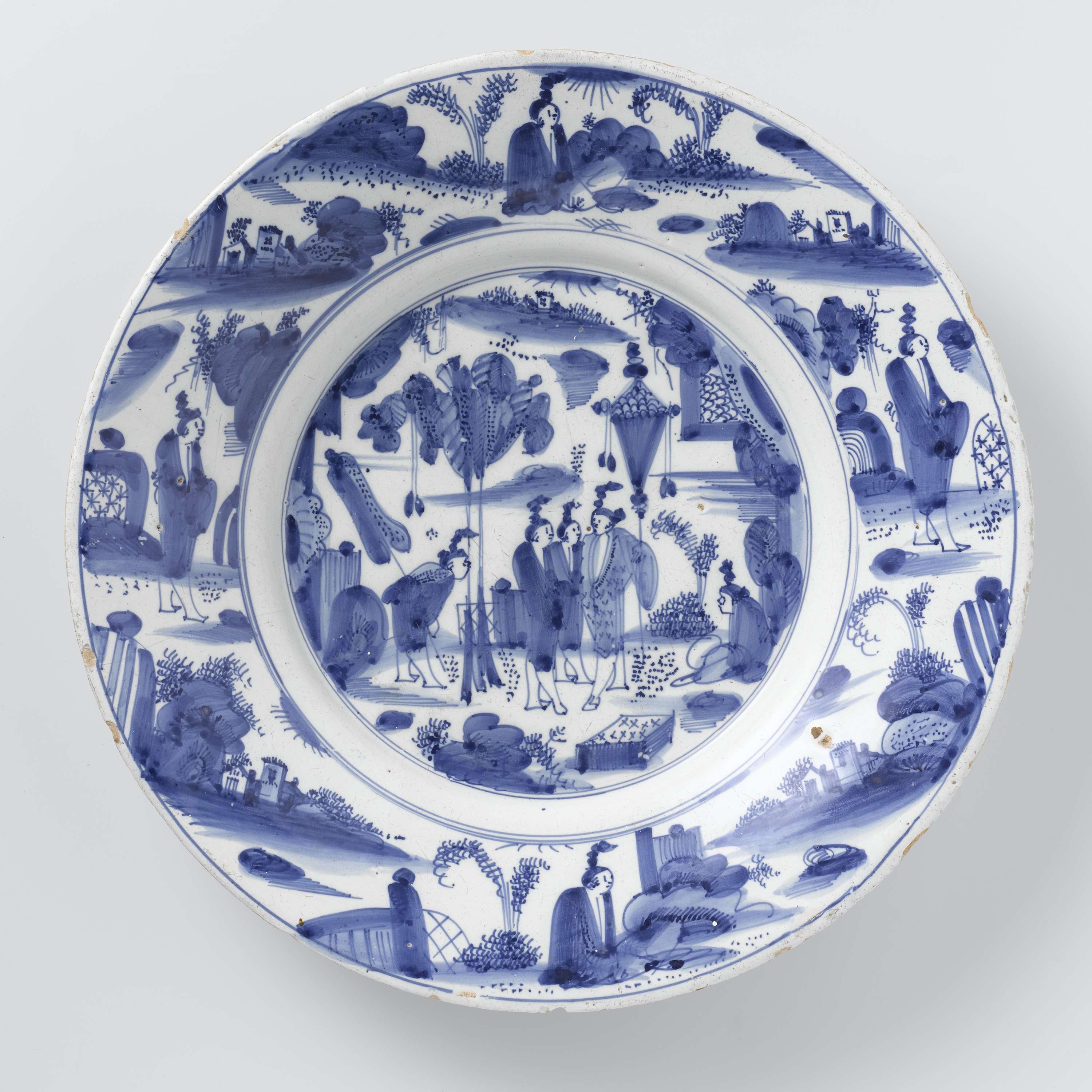 Ronde schotel van blauw beschilderde faience, met op het plat vier staande figuren en een zittende. Op de rand zijn landschappen, twee staande en twee zittende figuren geschilderd. (Nederlands)