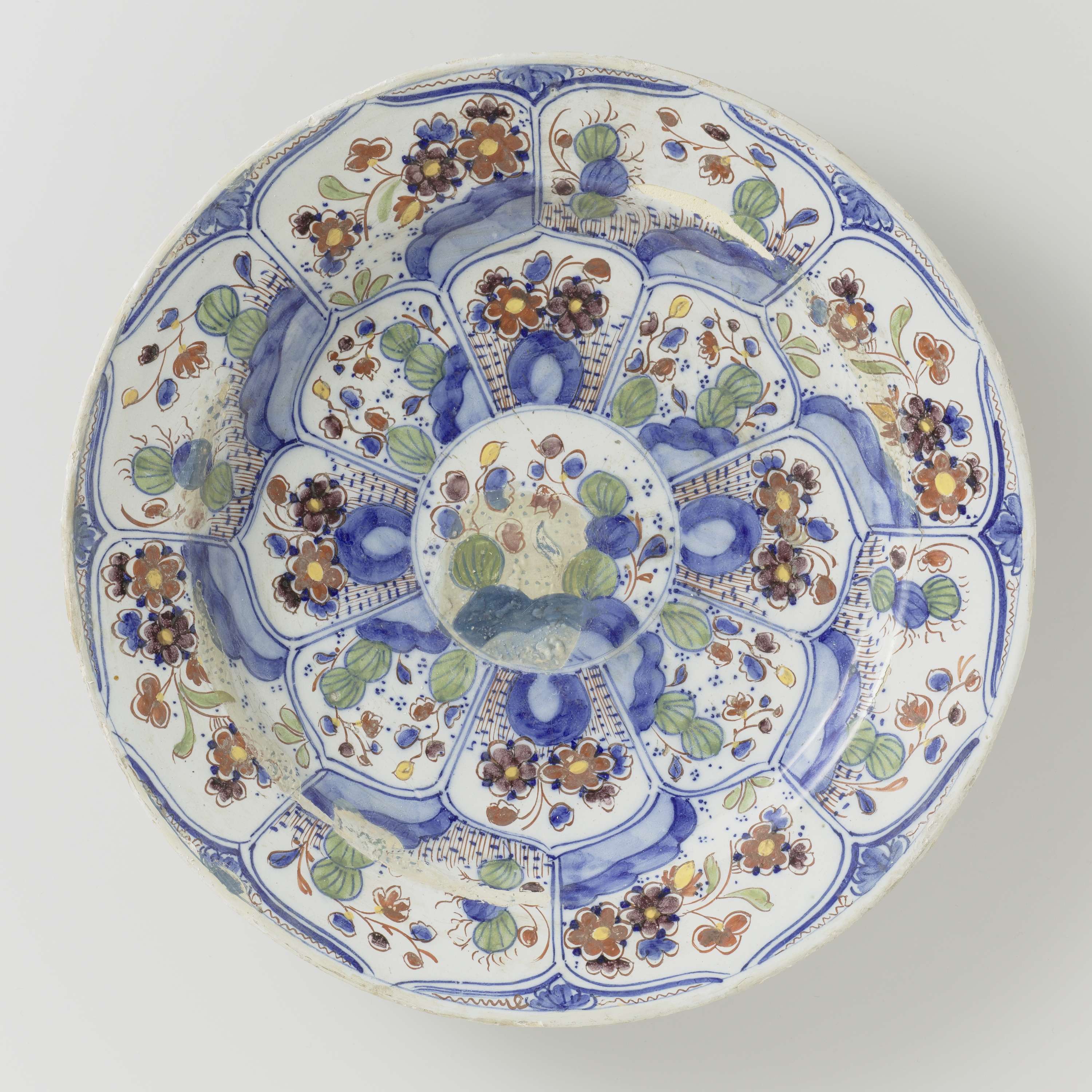Schotel van veelkleurig beschilderde faience (Nederlands)