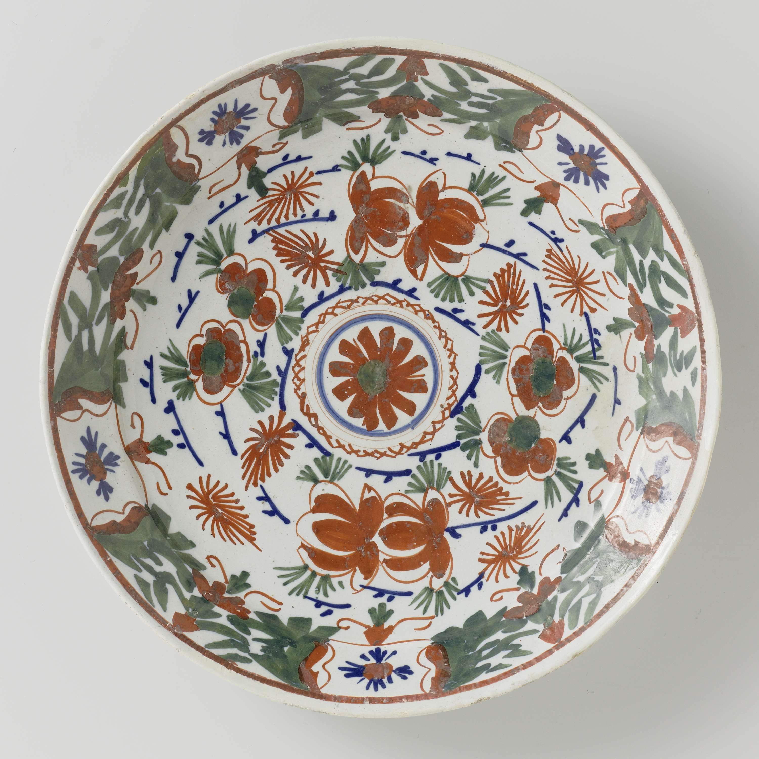Rond bord van veelkleurig beschilderde faience, beschilderd met bloemen en bloemmotieven in de kleuren groen, rood en blauw. Bij het bord horen twee identieke borden met invnrs. BK-NM-13351-e en BK-NM-13351-g. (Nederlands)