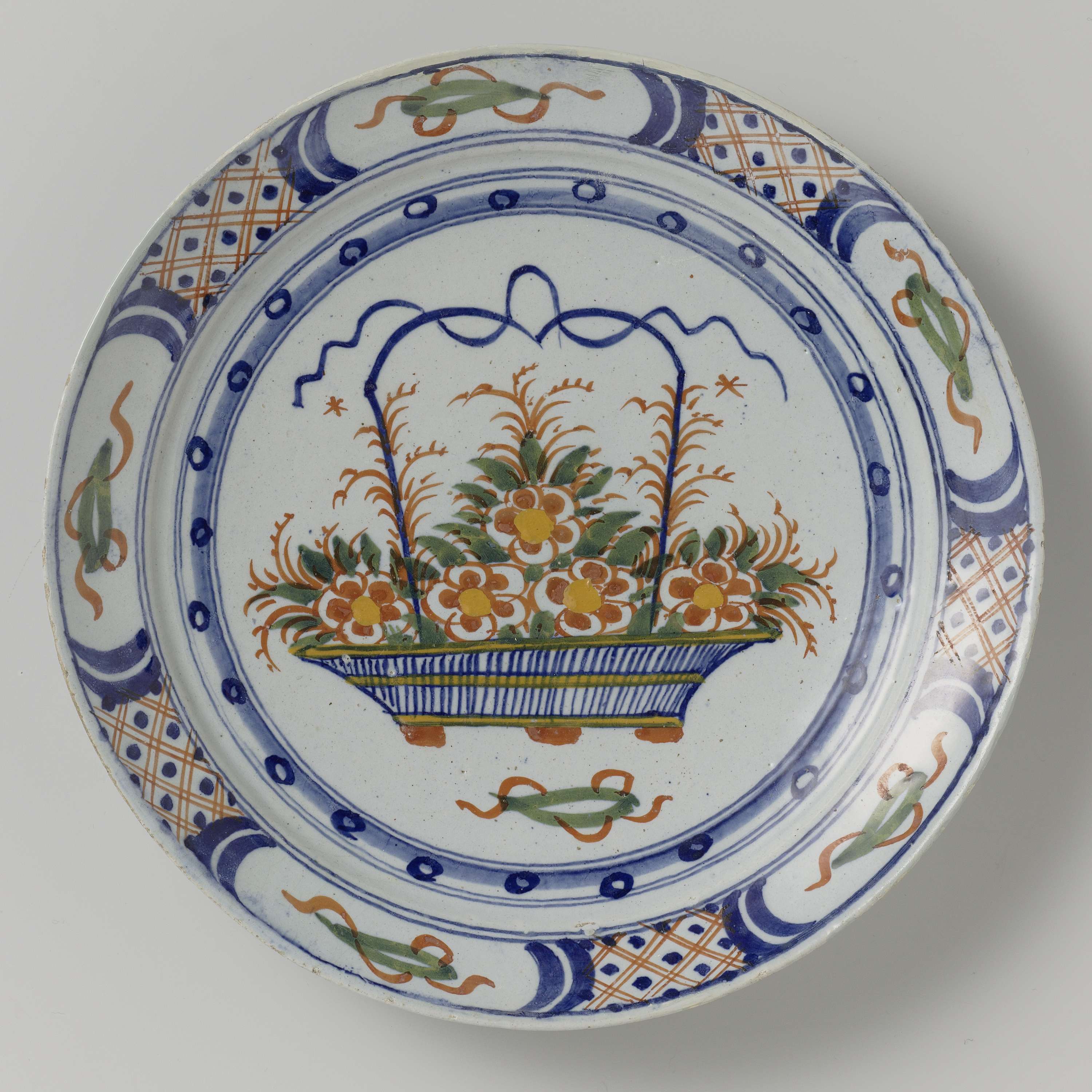 Rond bord van veelkleurig beschilderde faience, met op het plat een mand met bloemen in de kleuren blauw, groen, geel en rood en op de rand een veelkleurig Chinees motief. Bij het bord horen vier identieke borden met de invnrs. BK-KOG-2428-a, BK-KOG-2428-b, BK-KOG-2428-c en BK-KOG-2428-d. (Nederlands)